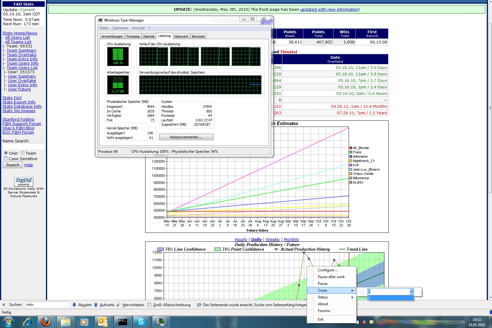 Mal sehn ob ich draufkomme warum er stehen bleibt :-/ Hier nochmal ein Screenshot wegen den Cores. Irgendwie hab ich auch das Gefühl, dass ich mit 4 grafischen CPU Clients mehr Punkte mache als mit dem SMP. Muss ich aber nochmal auf längere Zeit analysieren.