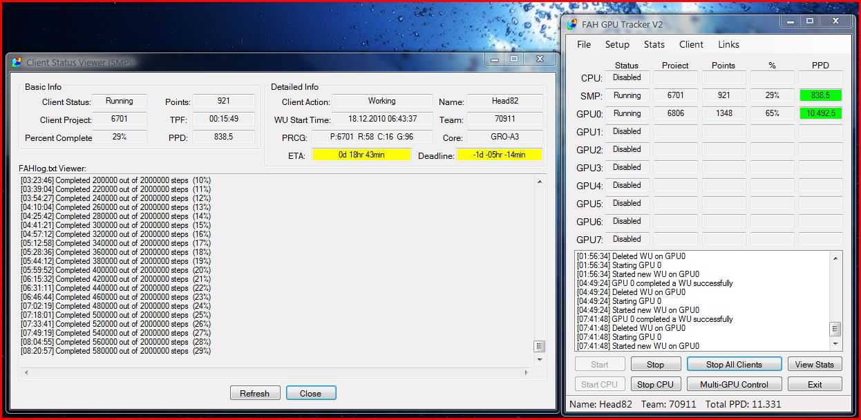 @DvP: Die letzten Tage habe ich mit dem Tracker für das neue Team gefaltet. Die erste BigWu wurde gleich mit den vollen Bonuspunkte angerechnet. Allerdings wurde dann bei der 2. BigWu nur die Grundpunkte angerechnet, so als ob ich die Deadline nicht geschafft hätte (war aber 56h vorher fertig). Daher habe ich den GPU Tracker erst mal ausgemacht und lasse die normalen Clienten SMP und GPU falten. Jetzt bekomme ich auch wieder die vollen BigWu Points.