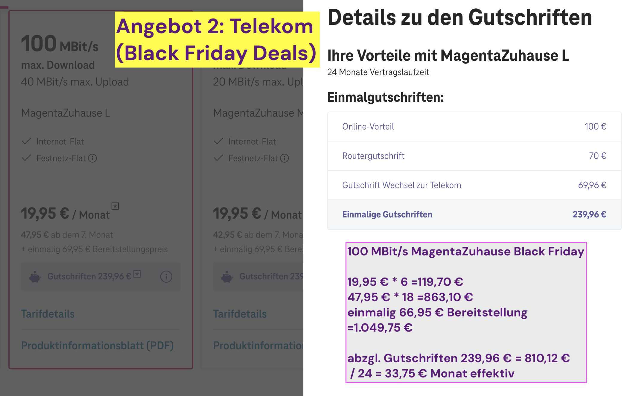 Bei der Telekom direkt (Black Friday Angebot) käme ich auf 810,12 € netto für 24 Monate (siehe Screenshot 2), also 33,75 € / Monat, deutlich teurer.