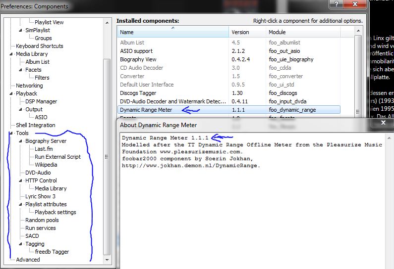 Habe gestern Abend schön meinen Foobar 2000 Player eingerichtet und wollte dann gleich noch, den plug in Dynamic Range 1.1.1 installieren...nach vielen versuchen habe ich bemerkt dass die eine Version abgelaufen ist und dafür die aktuelle 1.1.1 installiert...das plug in lässt sich zwar installieren aber es erscheint einfach nicht in der tools liste, damit es angewendet werden kann.