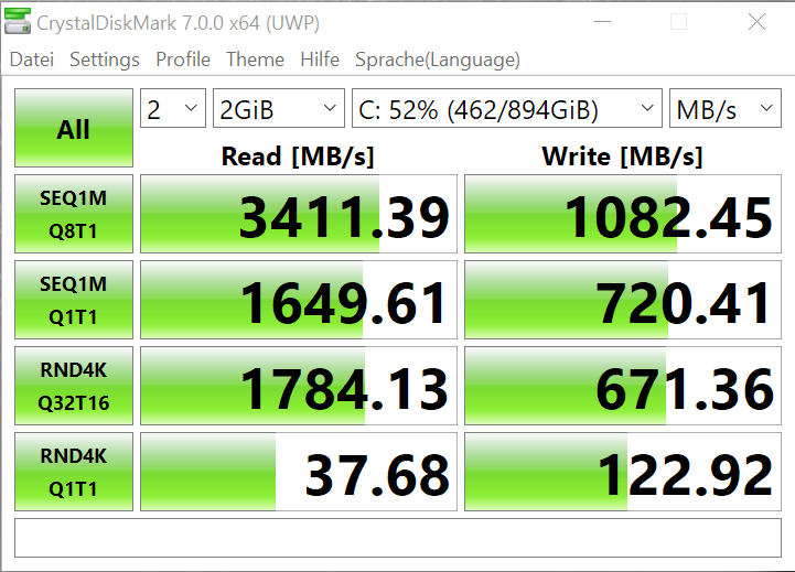 Du hast nur ~1.000 MB/sec beim Schreiben? Meine SSD hatte ich zu Beginn nach dem Einbau auch getestet und habe da ~3.000 MB/sec erreicht.