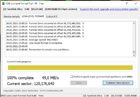 Neu4: Heute früh hatte dieser USB-Stick wieder keine Partition, als ich es so machte, wie es das letzte mal funzte, so hat es diesmal nicht gefunzt, ich nahm den "HDD LLF"