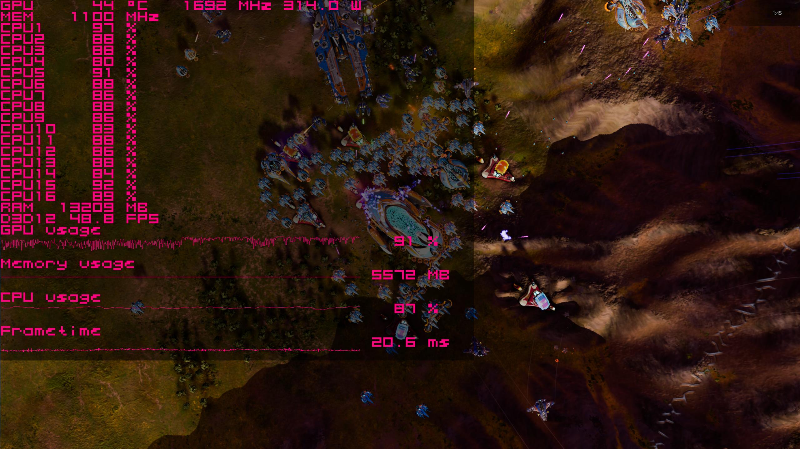 Etwas später im Benchmark. Ein Hoch auf DX12! eine Grafikkarte, die gut ausgelastet wird, und das obwohl 16 CPU Threads mit 80+% Ausgelastet werden. Viel mehr kann man aus der Hardware nicht rausholen.