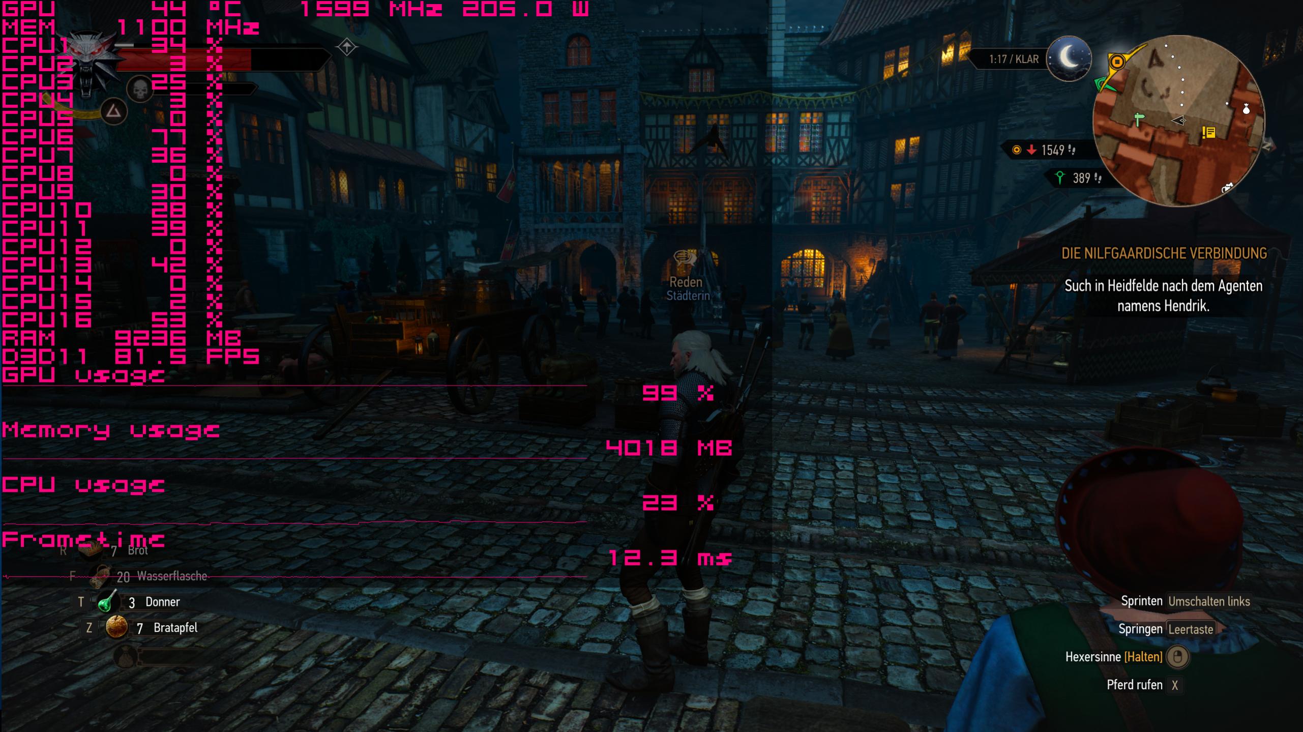 Hier ist alles Ok. Frametimes sind niedrig und ohne Ausreißer, GPU ist voll ausgelastet, Kein CPU Kern ist überlastet, Ram und Grafik Memory haben noch Platz, GPU ist übertaktet, hält aber einen hohen Takt, Power limit ist nicht ausgereitzt(ca 390W)