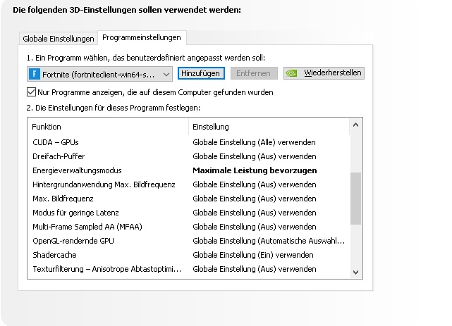 wie läuft es mit standard-settings in fortnite? auch rucklig? Hast alle settings mal an/aus gemacht? (nvidia low reflexes vllt zickig?) Wie gesagt mit nvidia-defaults da mal in Fortnite mit den settings rumspielen, wenn es nur dieses EINE game betrifft.