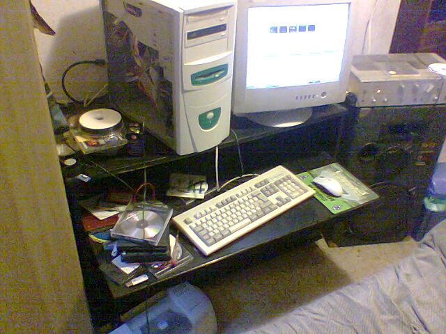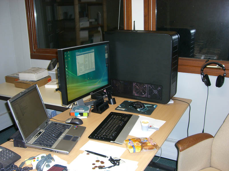 So, mein Arbeitsplatz. Wie immer nicht aufgeräumt. Es ist wirklich da, wo ich tagsüber arbeite, also nicht zuhause! Allerdings habe ich den Rechner selbst gekauft...