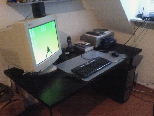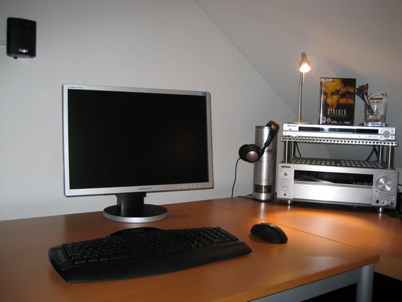 so sieht es bei mir aus. das kabelwirwar hinter den den pc will ich schon lange mal beseitigen, sage mir aber immer wieder "morgen ist auch noch ein tag".
