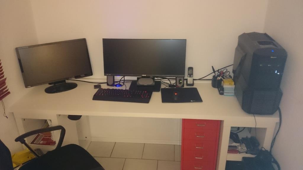 Die beiden Kabel die Ihr zwischen dem rechten Monitor und dem Rechner seht verschwinden noch, da wurden längere bestellt, die dann auch unterm Tisch landen.
