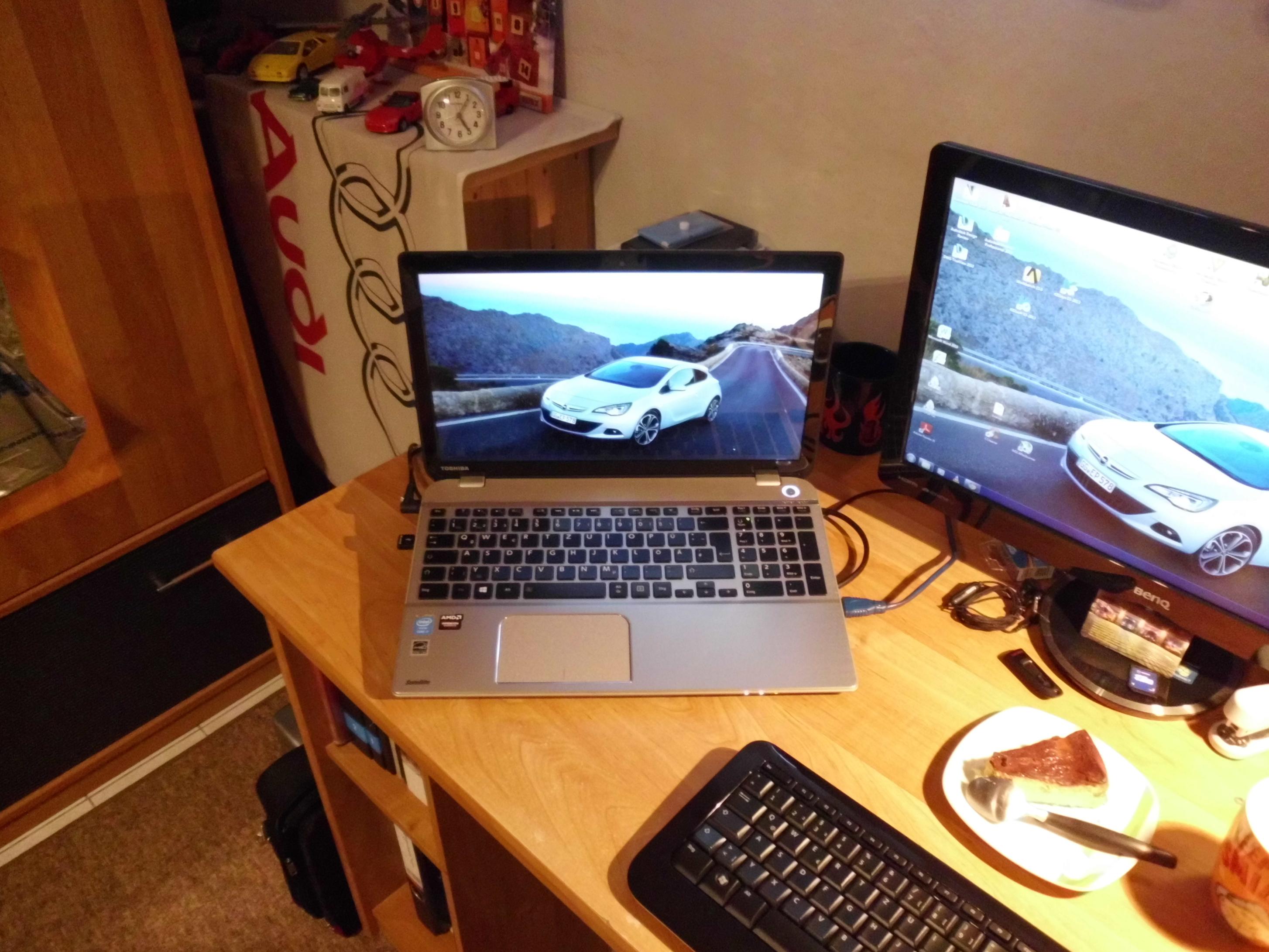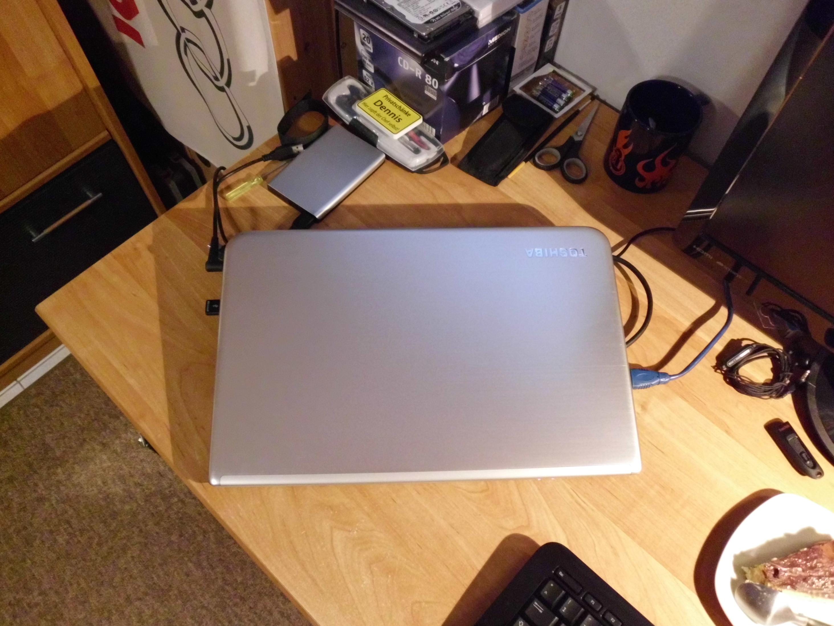 Meine neue kleine Workstation: Toshiba P50. Astreines Gerät und in wunderhübscher Alu-Optik. Problem => nun passen Bildschirm und Tasta nicht mehr zum hellen Finish des Notebooks...
