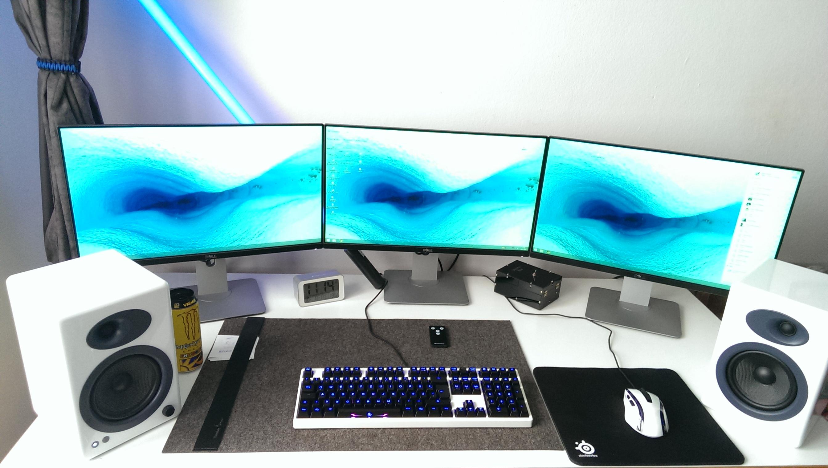 3x Dell Ultrasharp 2414h Audioengine 5+ (dafür muss ich mir noch was einfallen lassen.Habe die Dinger erst eine Woche Brauche da auf jeden Fall noch irgendwelche Ständer) Ducky Shine 3 in weiß lackiert Roccat Kone + auch weiß lackiert