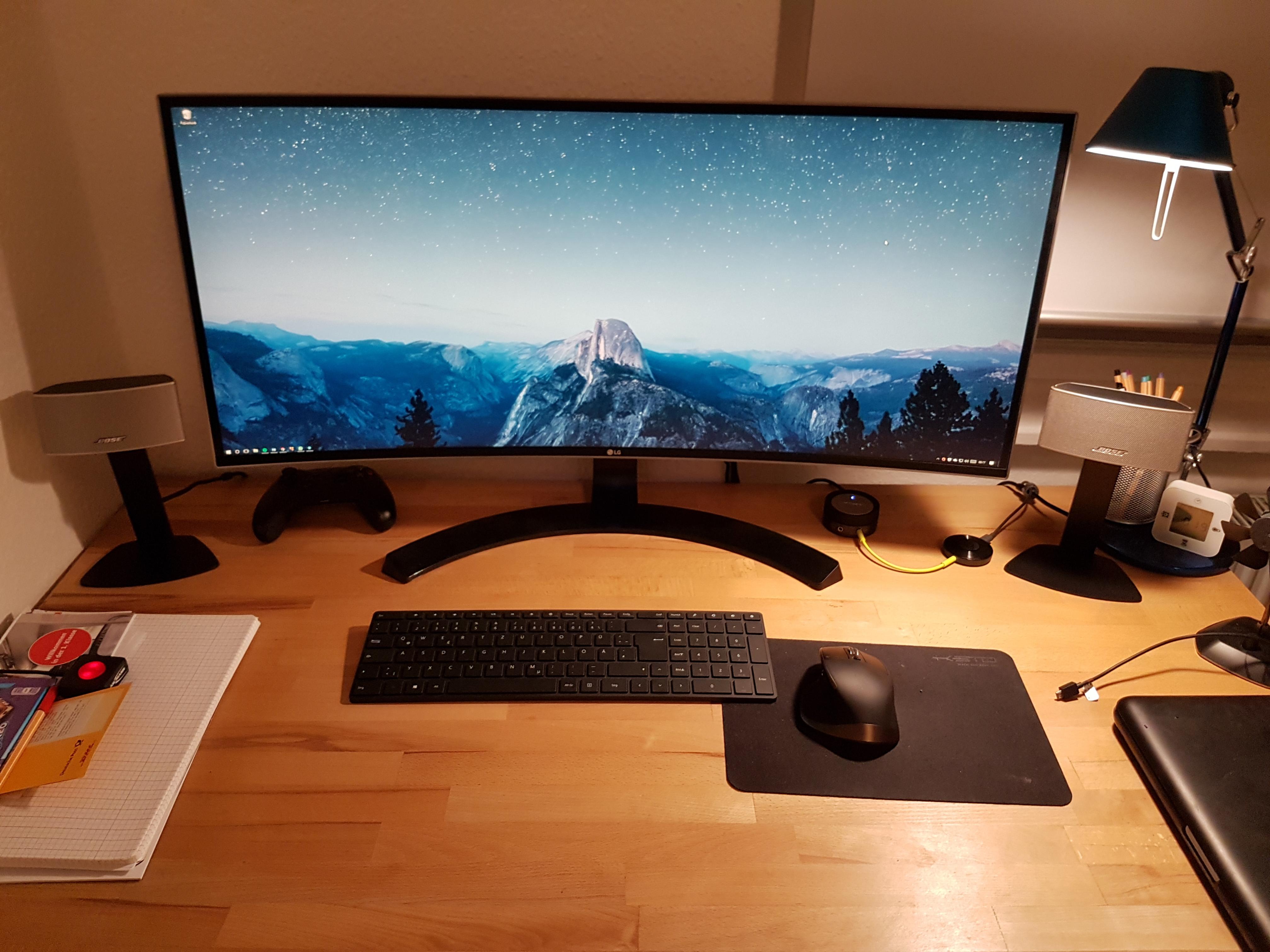 Als Monitor dient ein LG 34UC88 mit 34" 21:9 1440p curved. Lautsprecher sind die Bose Companion 50 (die ich übrigens im Gegensatz zu manchen Bose Produkten echt gut finde), Tastatur ist die Microsoft Designer Bluetooth und als Maus verwende ich eine Logitech MX Master.