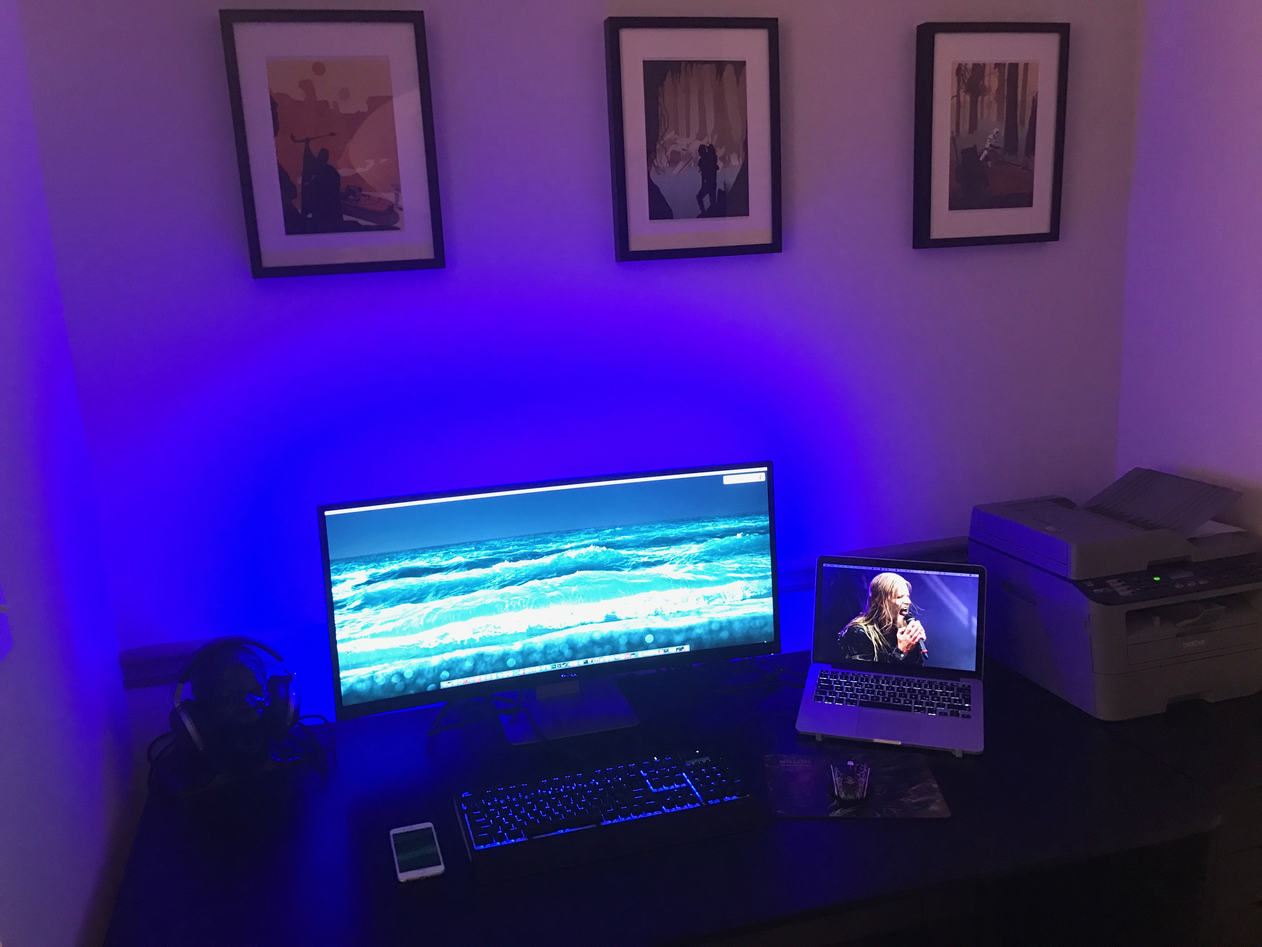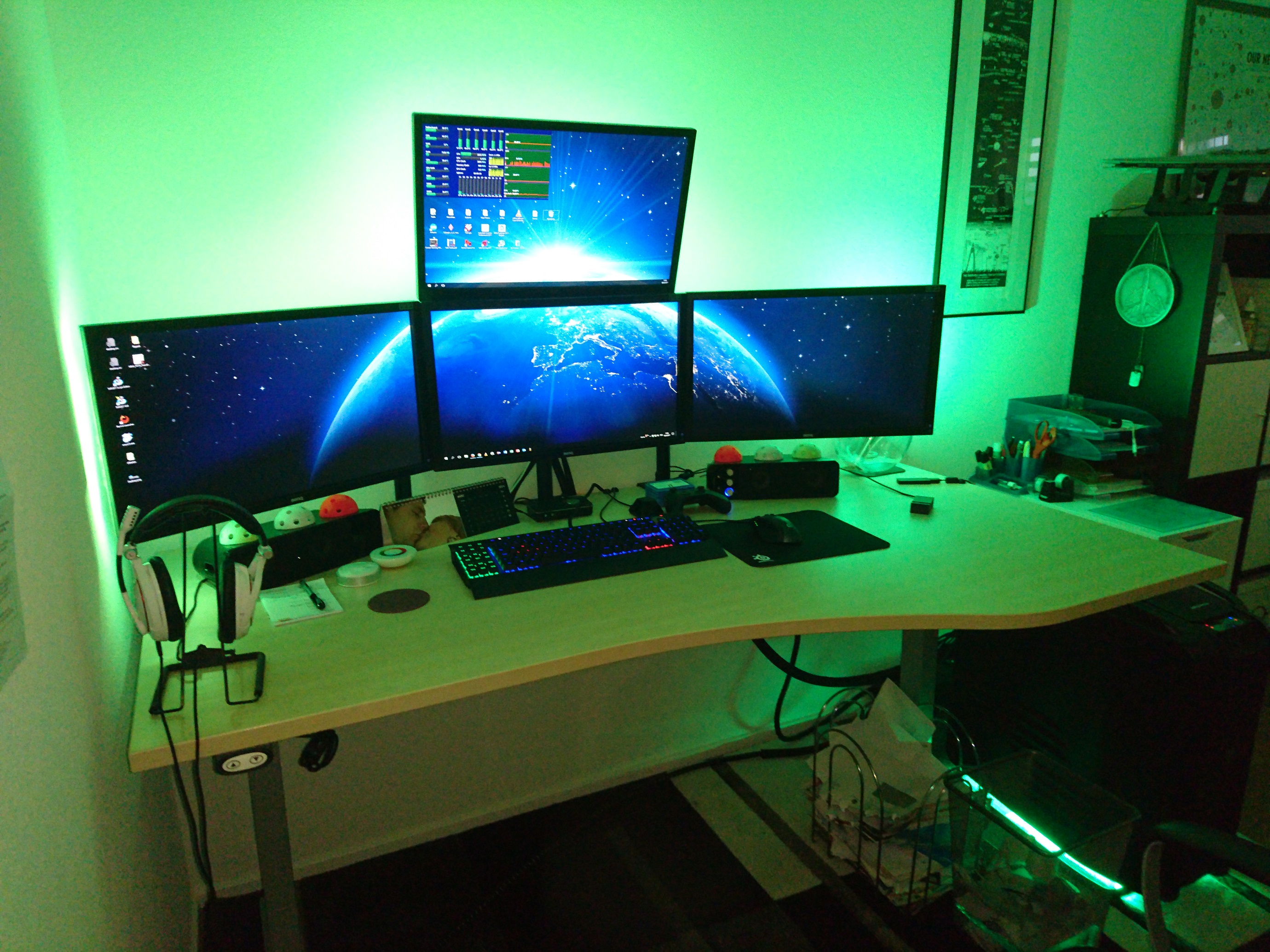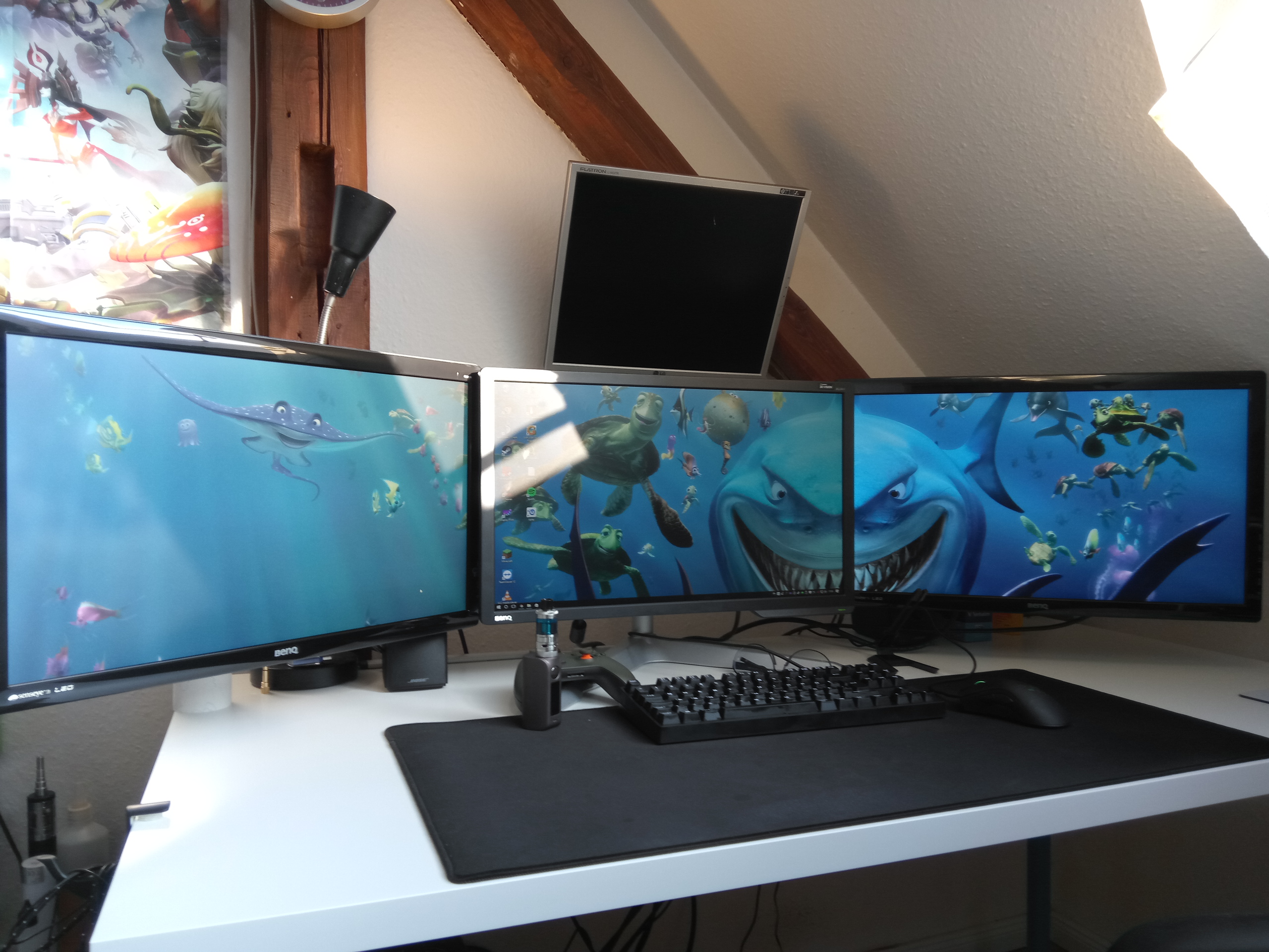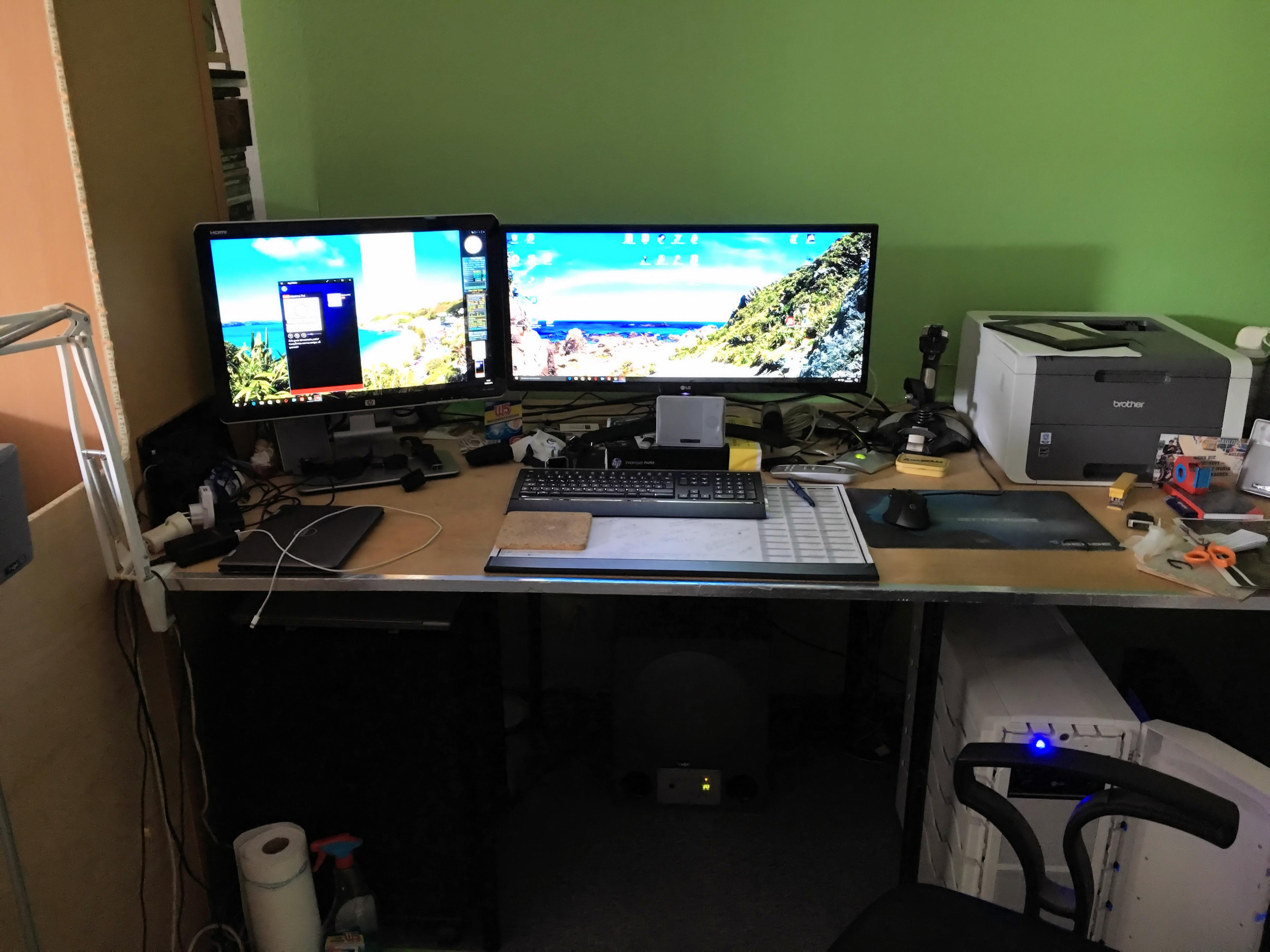 Leider ist mein Schreibtisch nicht besonders breit, deshalb sieht es seit dem Upgrade auf 21:9 recht gedrungen aus, aber geht noch finde ich.