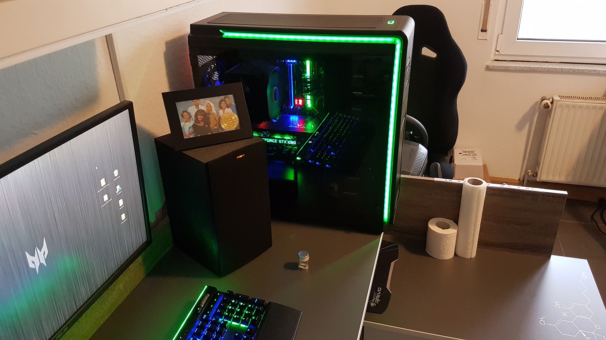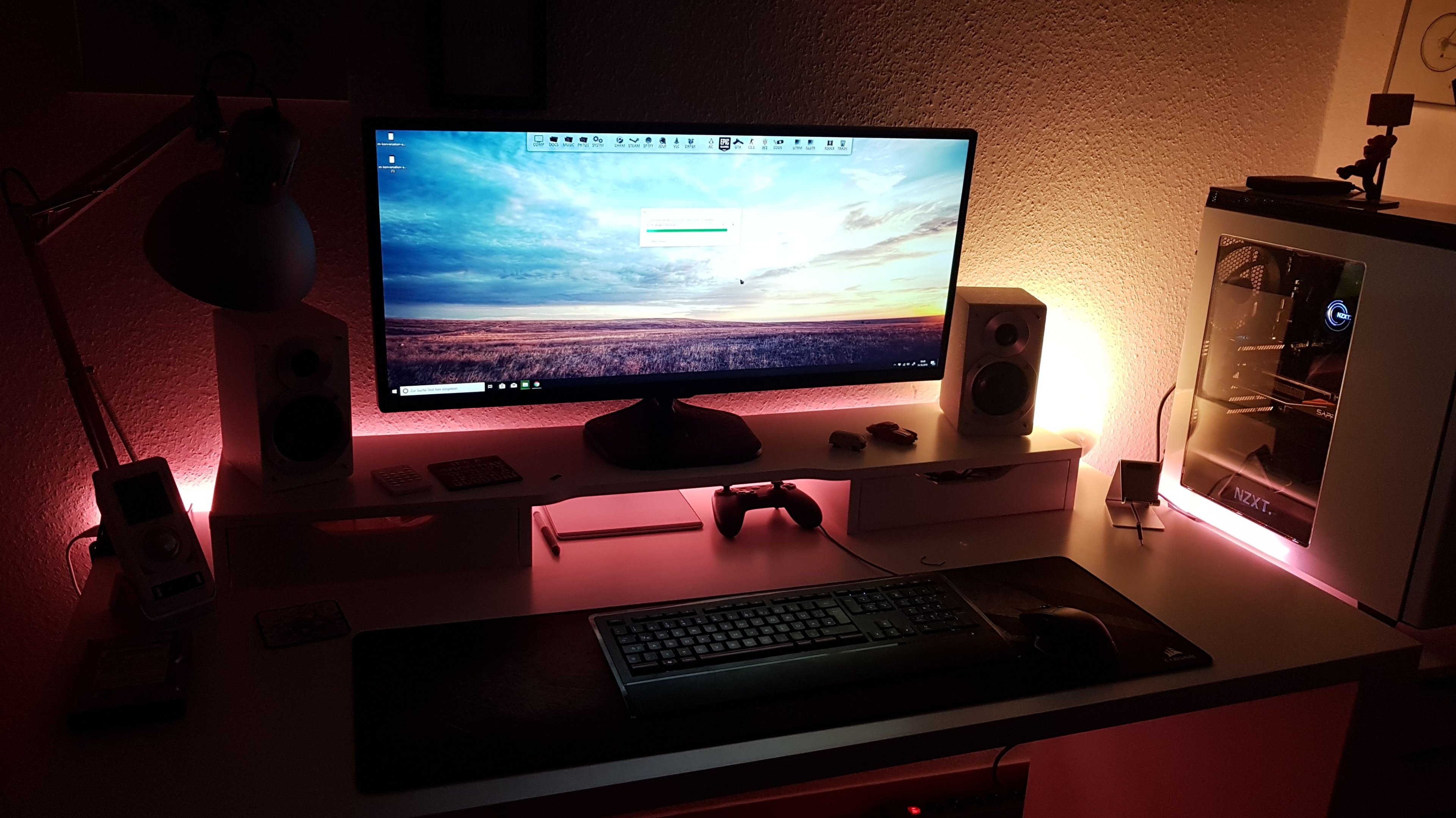 Neu hinzu gekommen sind ein Philips hue lightstrip hinter dem Schreibtisch sowie die erste hue go Lampe auf der rechten Seite neben dem Lautsprecher. Die zweite folgt in den nächsten Tagen.