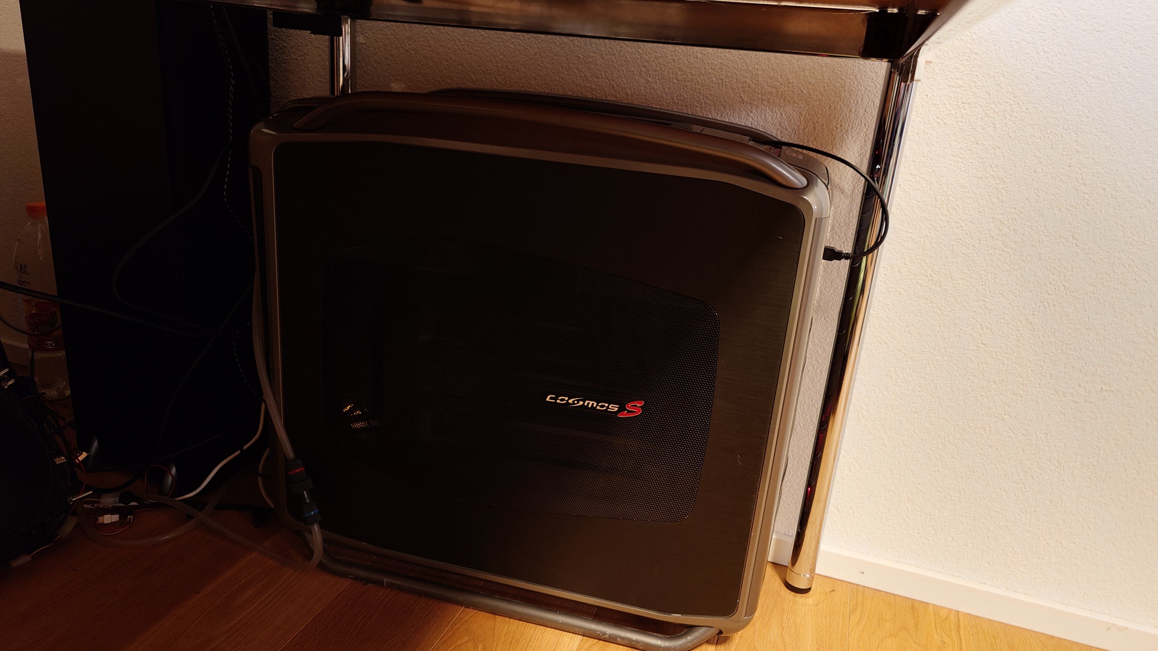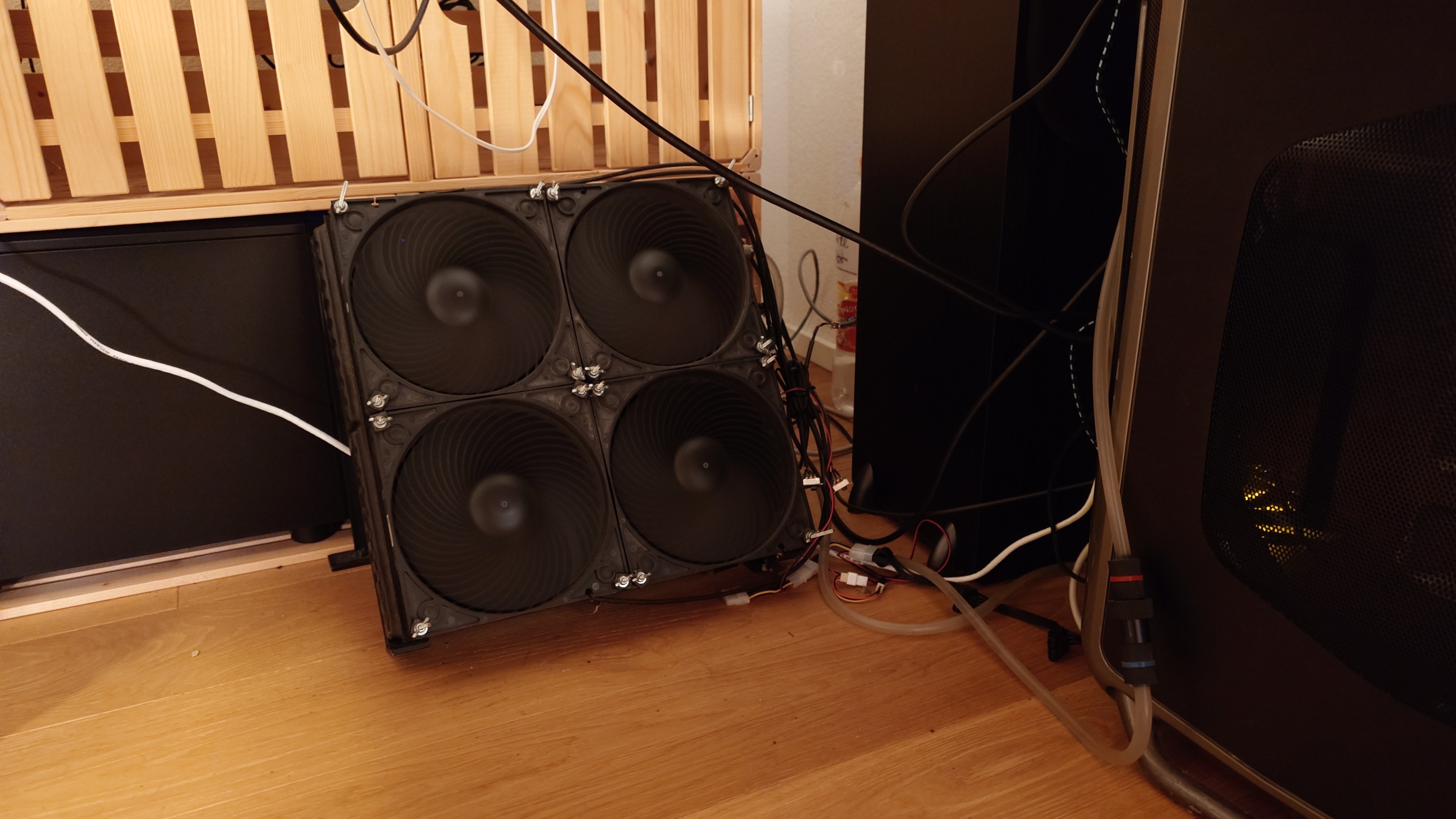 Unten Links am Schreibtisch steht mein PC mitsamt den externen Komponenten der custom WaKü: Ein Mo-Ra 3 420 und ein gedämmtes Holzgehäuse, in dem ich Pumpe & Reservoir geparkt habe. Damit ist der PC in praktisch allen Lebenslagen lautlos.