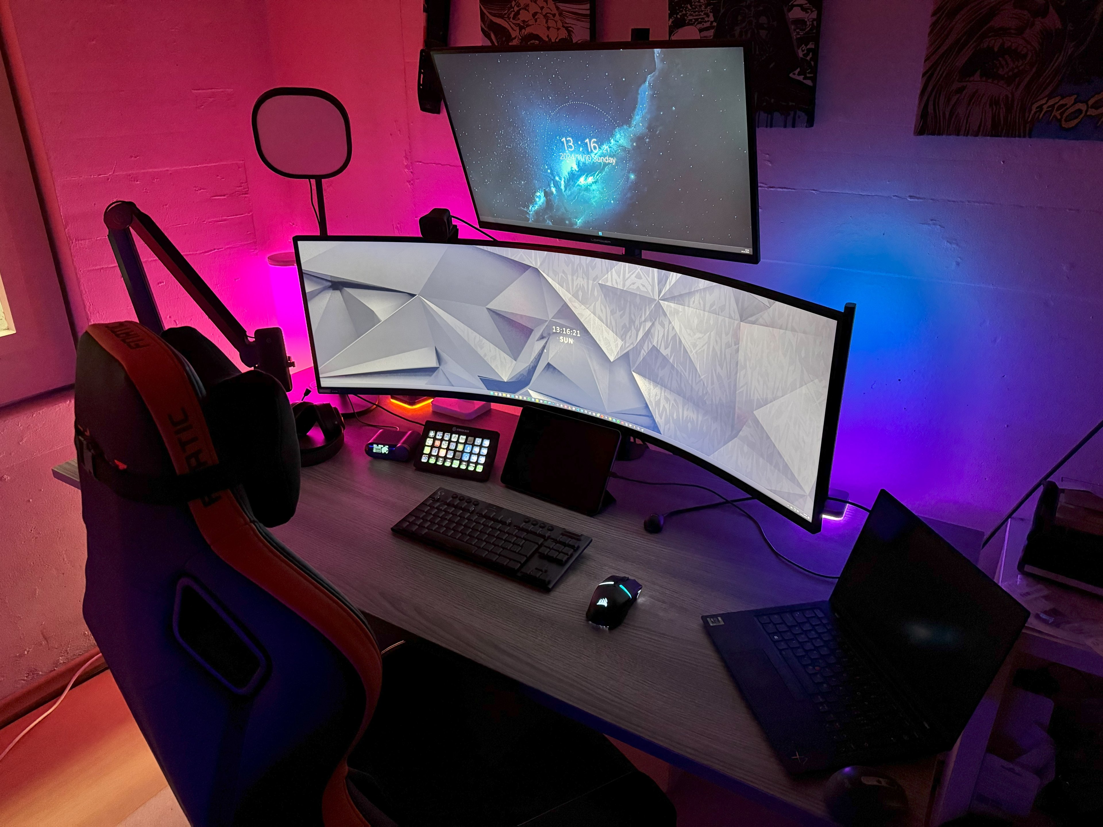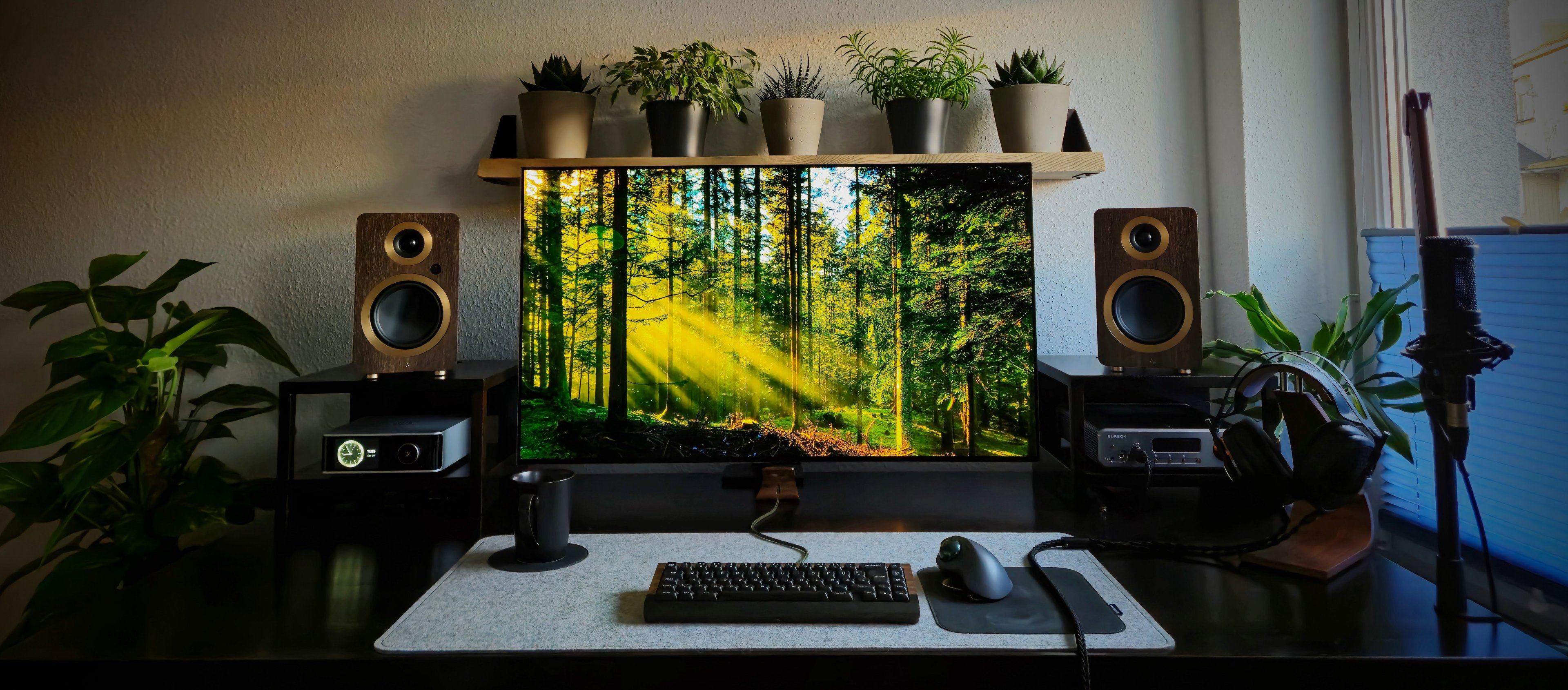 Die riesige Tischplatte und die großen Lautsprecher lassen den 40" Ultrawide praktisch proportional aussehen, als wäre das ein 34" auf einem normalgroßen Schreibtisch.