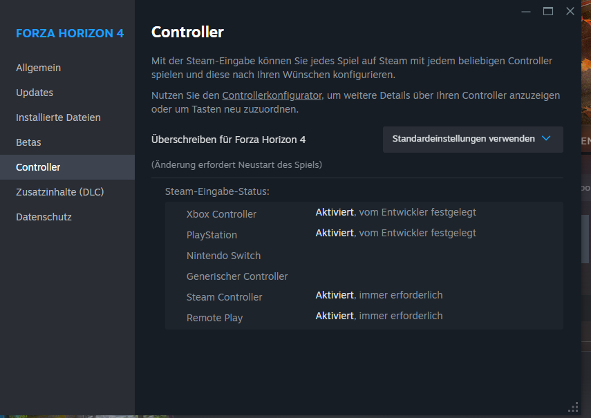 ich spiele Forza Horizon 4 mit Logitech G920. Die Tasten werden mir sowohl im Menü als auch im Spiel immer leider nur mit Nummern angezeigt statt XBox Belegung, wie z. B. A B X oder Y. Im Anhang zwei Screenshots um es verständlicher zu machen. Habe auch mit deinstallieren und neuinstallieren der GHub Software versucht. Leider keine Änderung. Der Dude auf YouTube nutzt auch das Logitech G920, aber er hat das Problem nicht. Woran kann das liegen? Hat jemand eine Lösung für mich? Im Internet finde ich keine Lösung. Das Problem wird auf vielen Foren erwähnt, aber die Threads führen zu nichts.