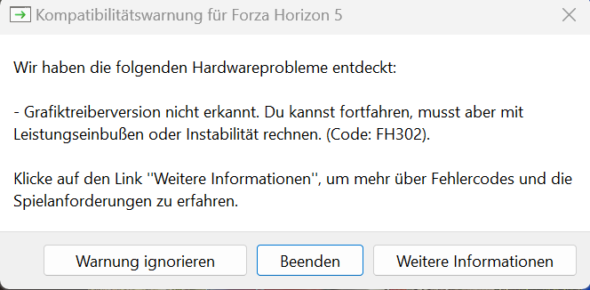 Ich stoße auf ein frustrierendes Problem, wenn ich versuche, Forza Horizon 5 zu spielen. Sobald ich das Spiel starte, erhalte ich den Fehlercode FH302 mit der Meldung, dass die Grafiktreiberversion nicht erkannt wurde. Ich wurde gewarnt, dass ich mit Leistungseinbußen oder Instabilitäten rechnen muss, und tatsächlich hat das Spiel ernsthafte Probleme.