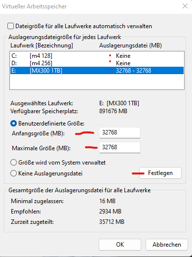 Dann stelle sie wieder zurück, einfach oben den Haken rein bei Dateigröße für alle Laufwerke automatisch verwalten und Festlegen und Neustart.