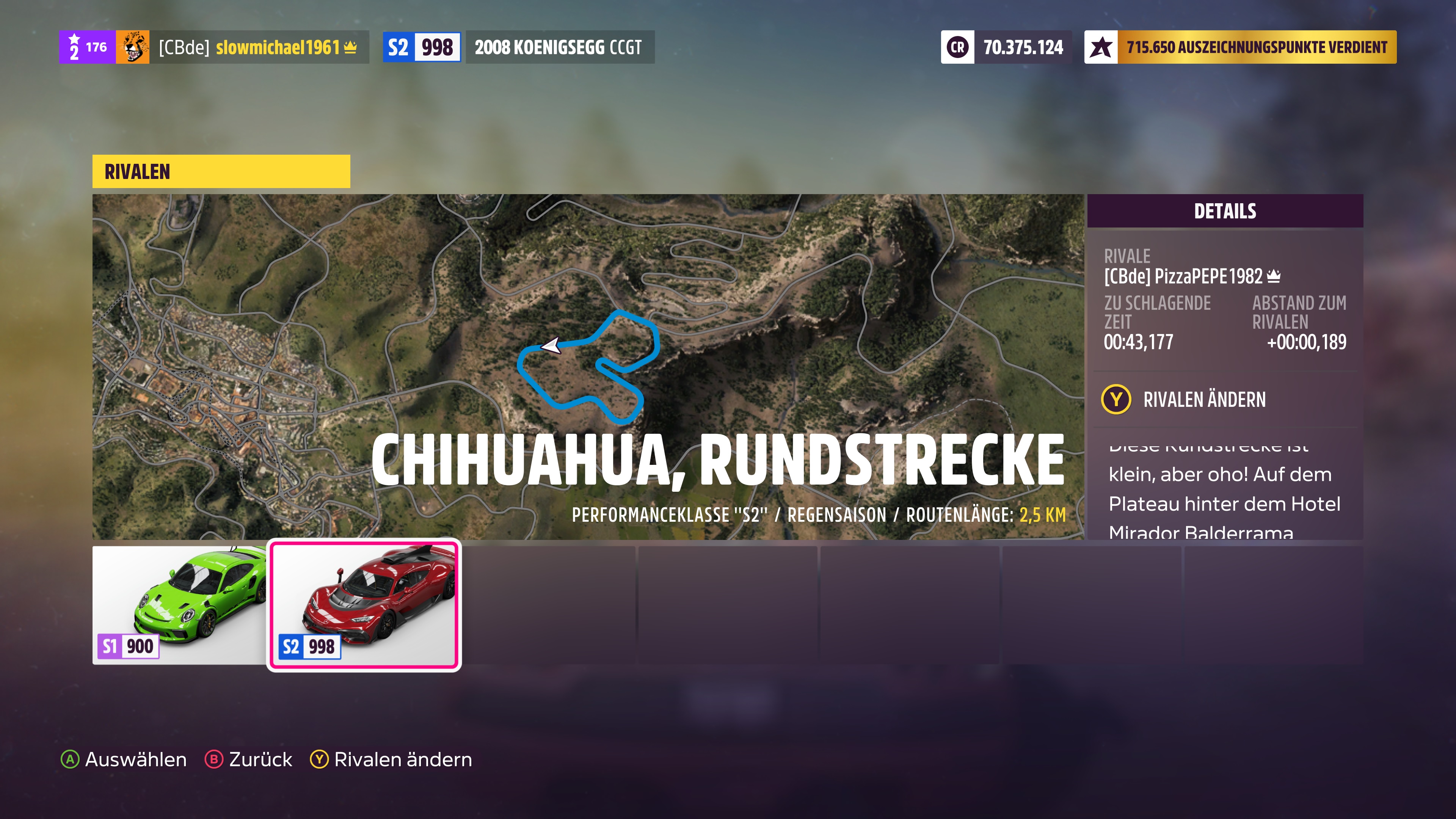 Die kommende Liste wird eine Saisonmeisterschaft und die Prüfung drin haben. Einmal "Special Event" mit dem Festivalwagen. 3 PR-Stunts, Trailblazer, Driftchallenge. Photochallenge. Forzathon. Eliminator.
