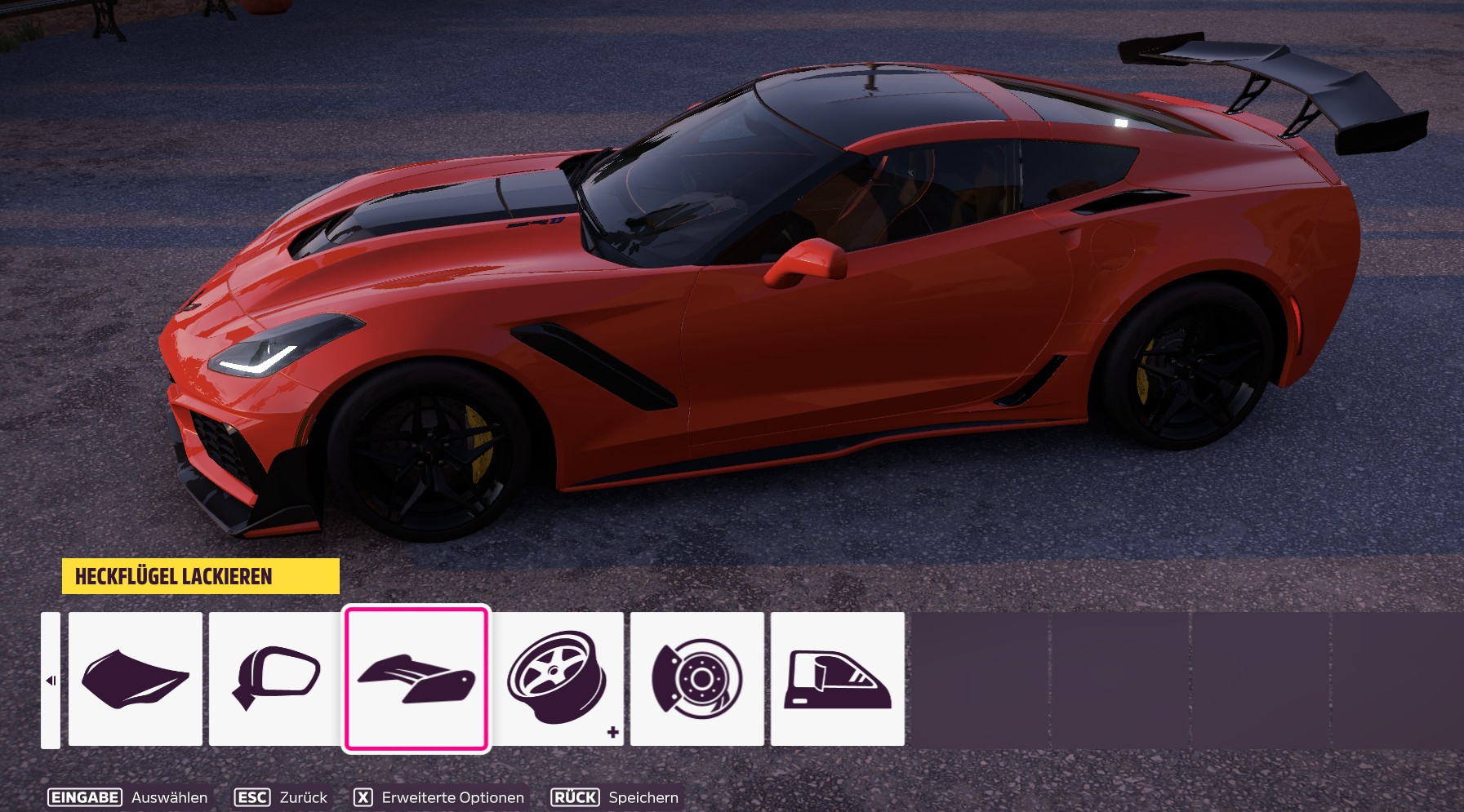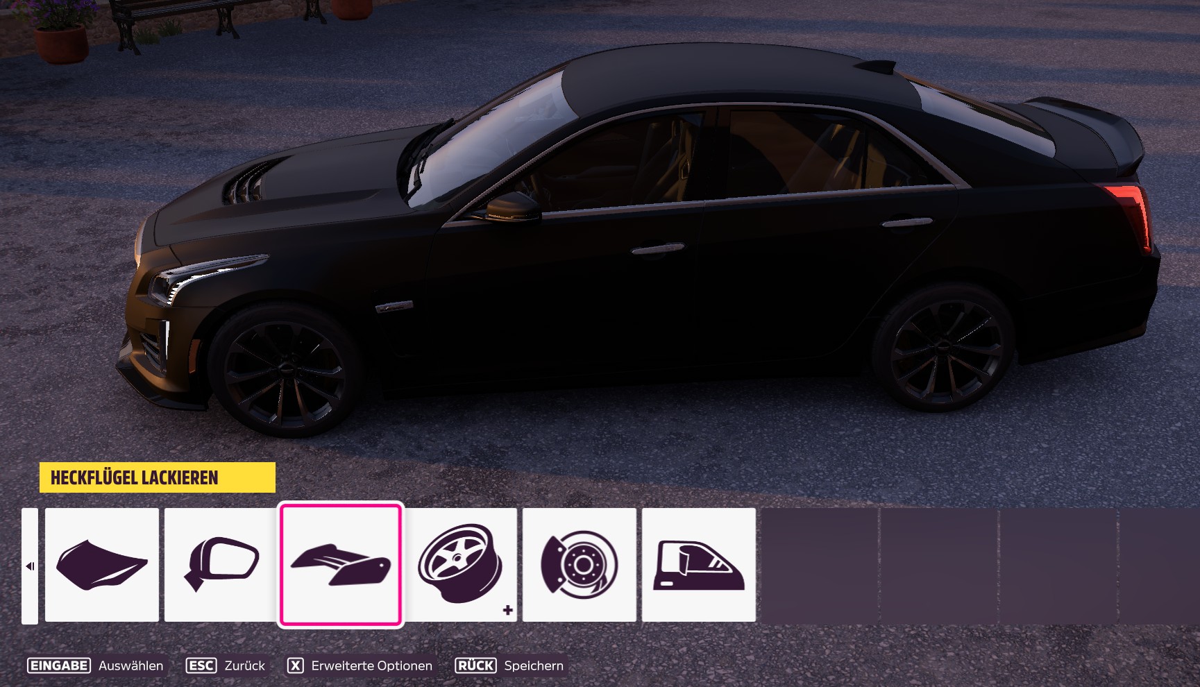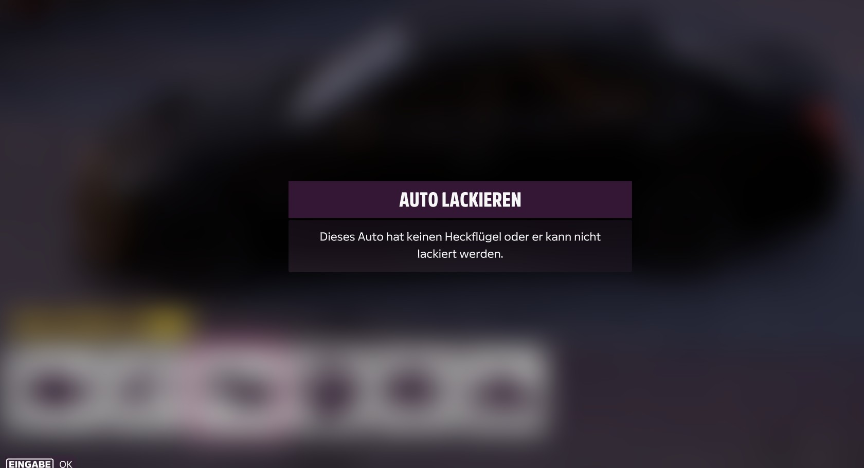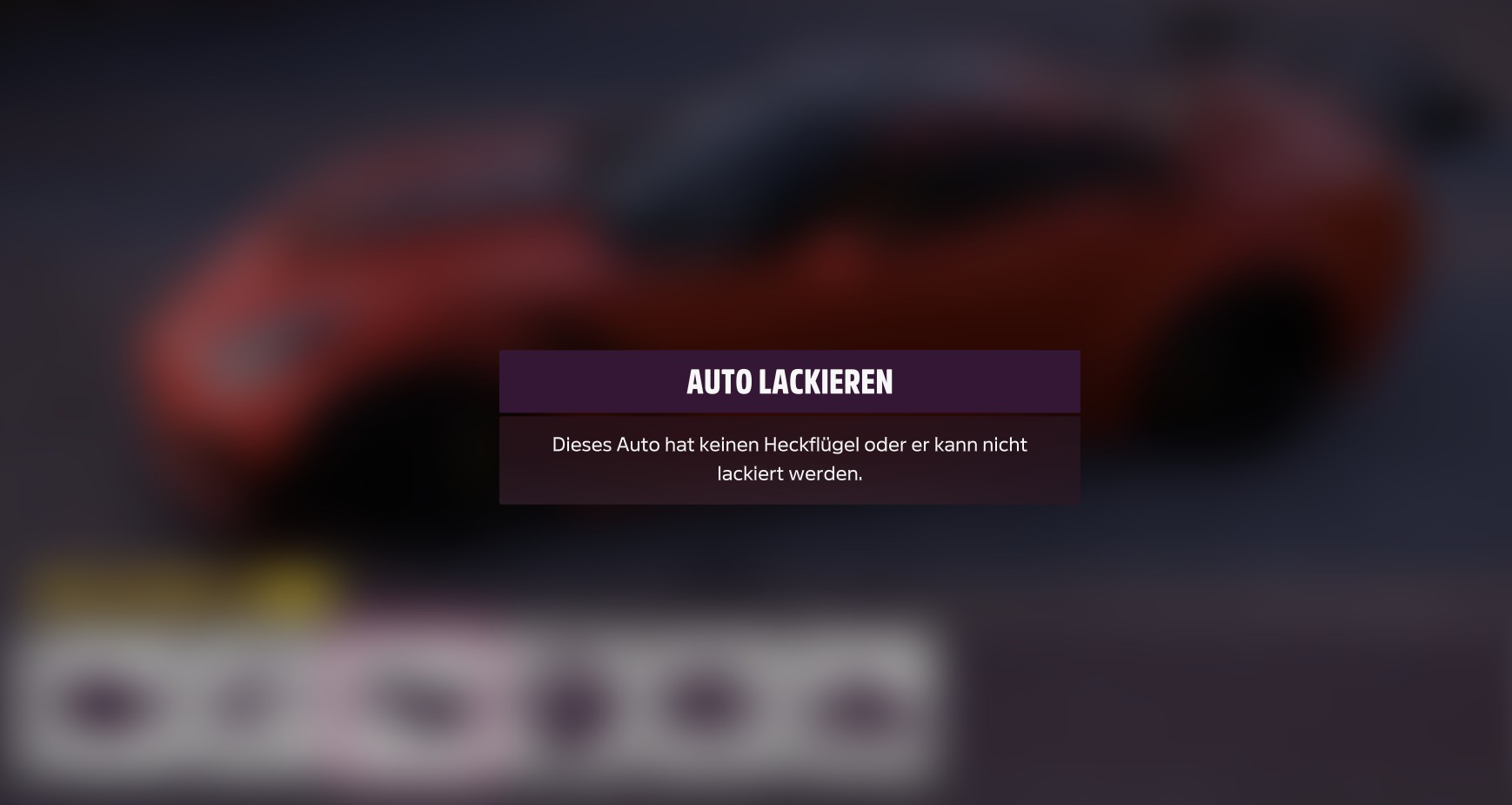Ich hab zuerst den Cadillac CTS-V mit einem kleinen Spoiler versucht. Wenn ich in der Leiste den Heckflügel anklicke dreht er das Auto auch zum Heckflügel. Klicke ich allerdings nochmals drauf erscheint die Fehlermeldung das er keinen Heckflügel hat, bzw. nicht lackiert werden kann.