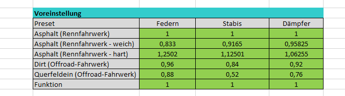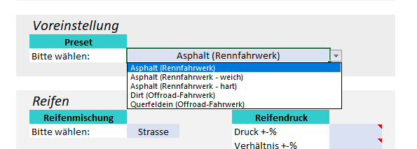 So, jetzt meinen Tuning Kalkulator mit Presets für Asphalt, Dirt und Querfeldein. Die Werte für die Berechnung sind alle Anpassbar: