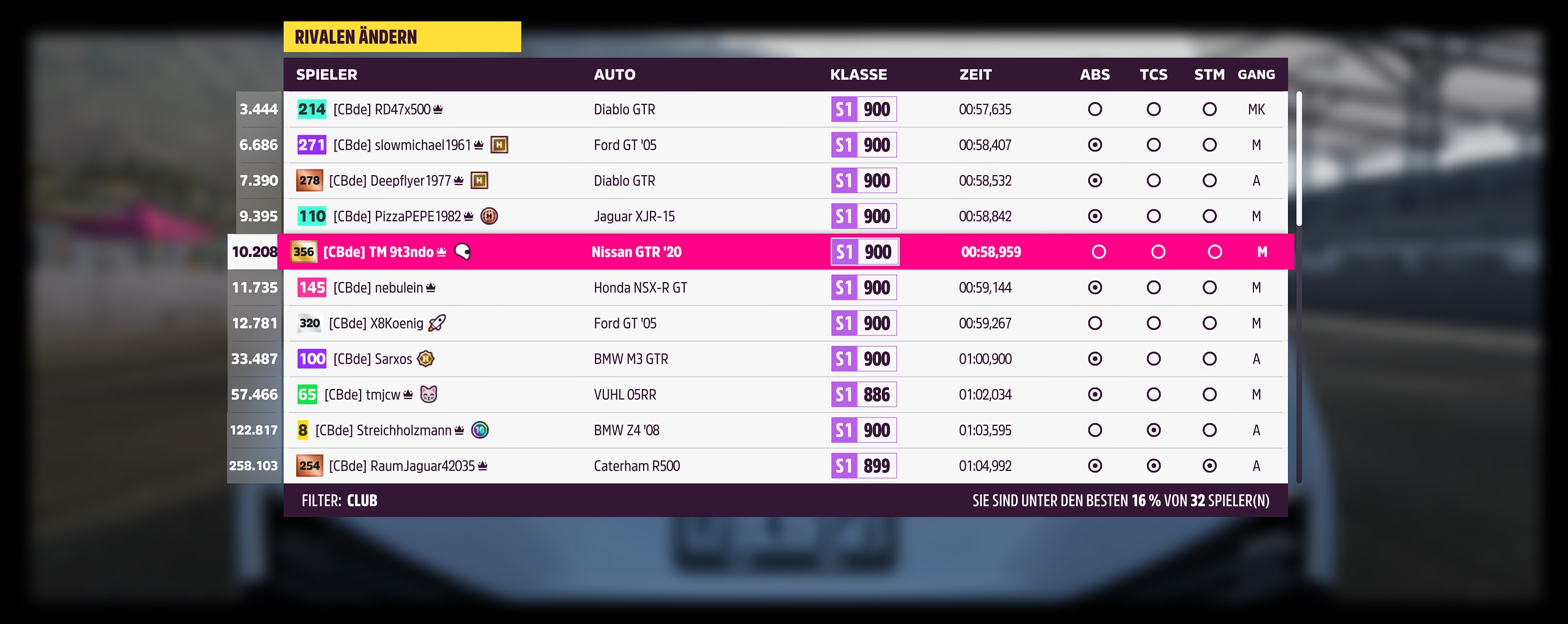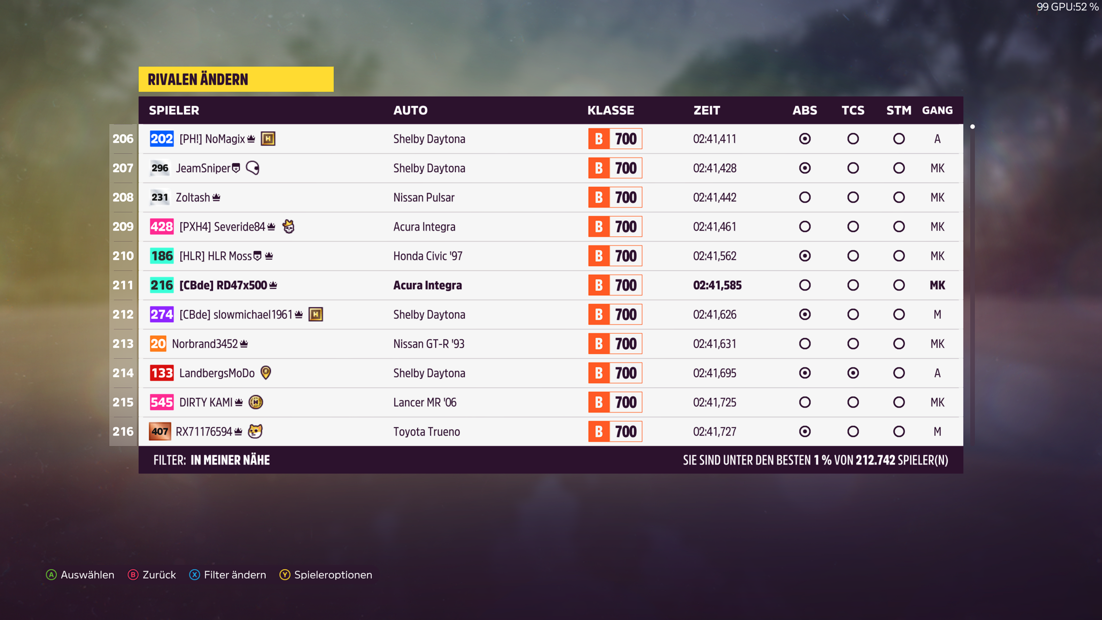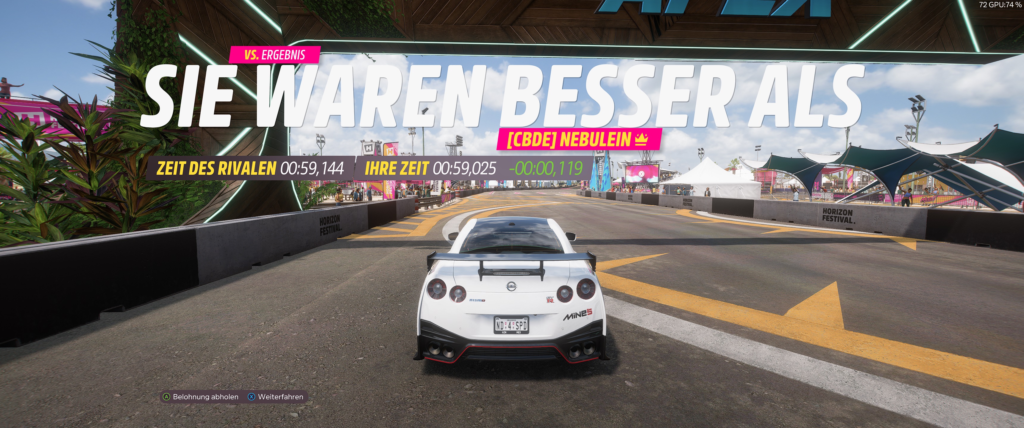 Dein Tune kam mir ansonsten gerade sehr gelegen. bin seit Vormittag am Nismo GT-R dran um den bei der Horizon Mexiko, Rundstrecke unter die 59sec zu drücken. Da konnte ich mal vergleichen und was anderes fahren. Mit deinem bin ich auf anhieb auf 59,375 gekommen