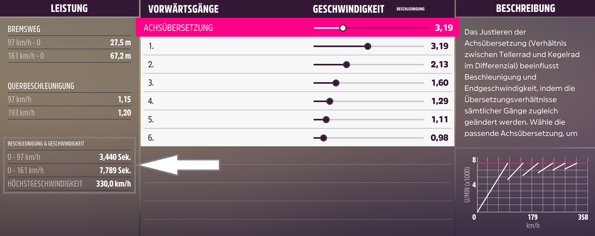 Dann passe Ich die anderen Gänge den ersten beiden an und fange dann an die Achsübersetzung so lange zu verkürzen, bis sich die Zahlen wieder verschlechtern und nehme dann den letzten "Klick", wo sie noch gepasst haben.