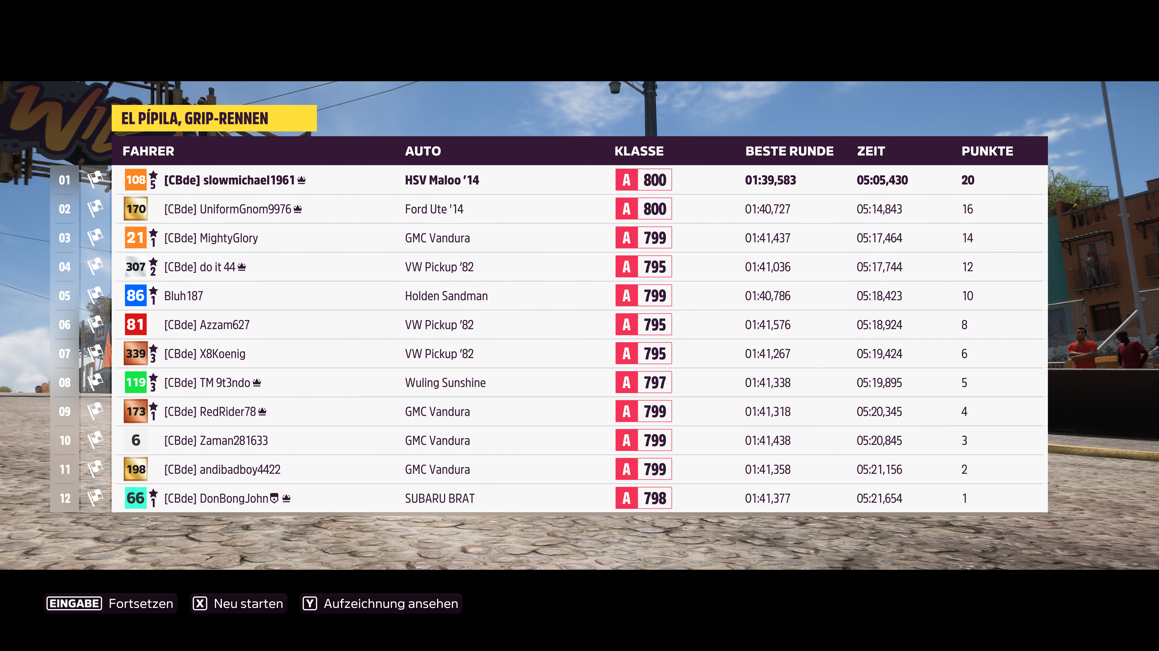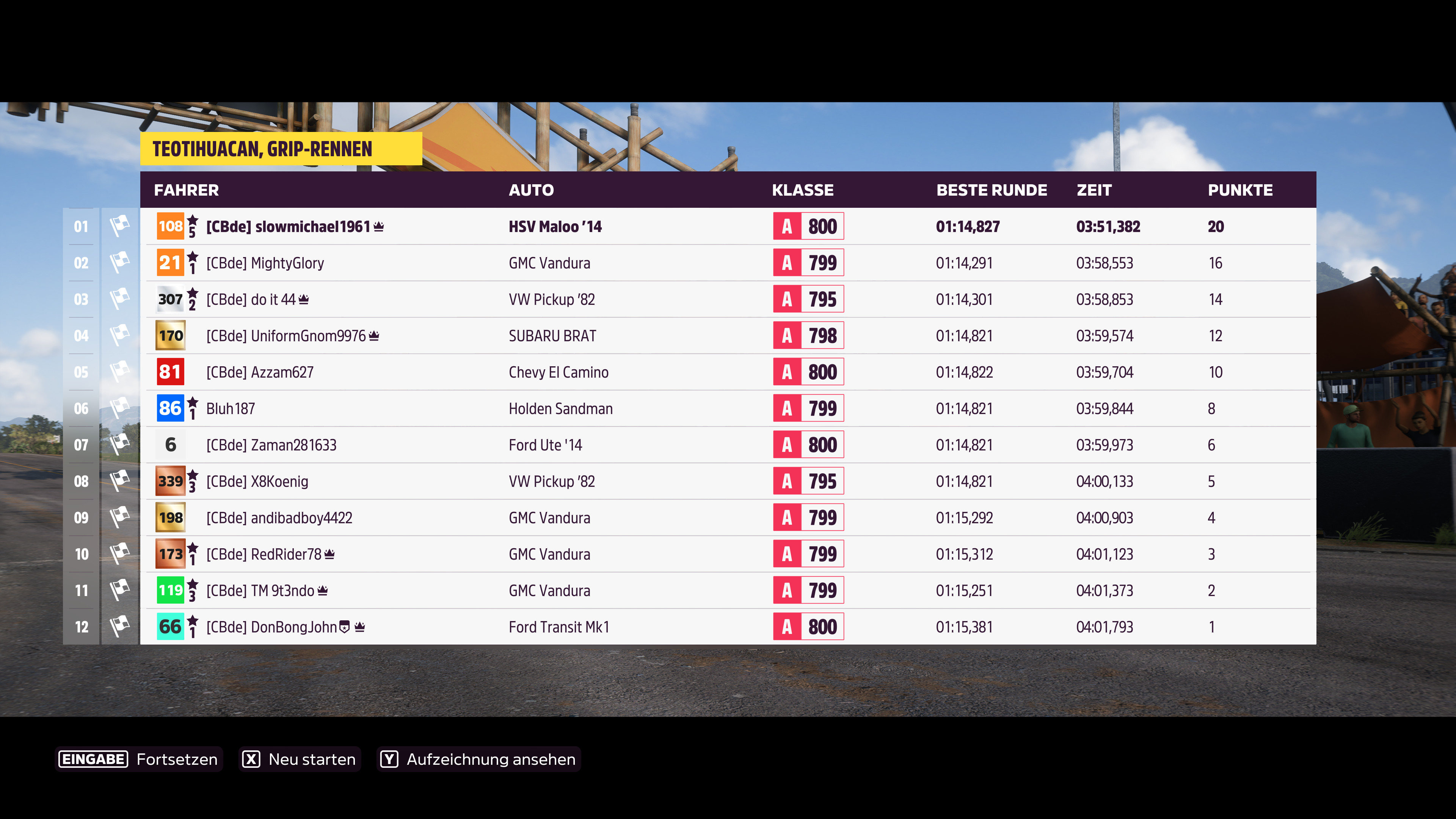 Kann Kapitel 4 Forzathon nicht abschliessen. Fahre einen 1997 Lamborghini Diablo SV und das Straßenrennen zählt einfach nicht. Davor ging alles bis ich die karosserie schwarz gefärbt habe.
