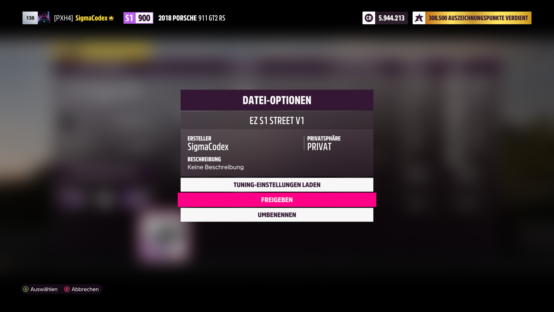 Mit dem Code kannst du gezielt ein Tuning/Design finden wenn jemand den Code teilt, so muss man nicht ewig lange rumsuchen (Auf Bild 2 zu sehen)eddietwo schrieb:Und was bedeutet dieser FREIGABECODE bei den Settings wenn man den Analogstick amController drückt?