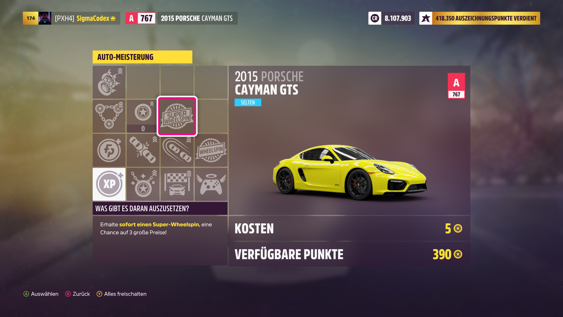 Hab mal nachgeschaut. Gibt nur einen normalen Wheelspin beim Cayman, nix Super-Wheelspin.Nolag schrieb:Beim Porsche Cayman GTS bekommt man für 14 Punkte noch zusätzlich einen einfachen Wheelspin
