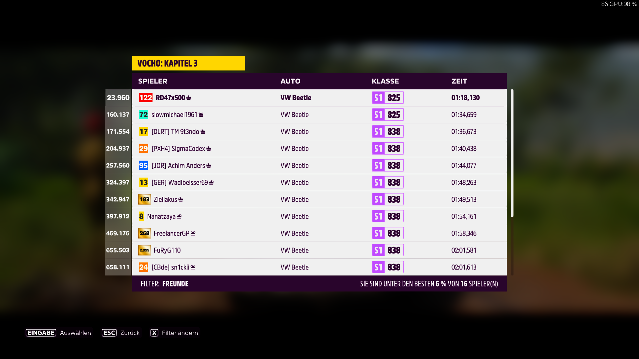 hab mich nun auch endlich ma da drangemacht und bemerkt das du es damals beim dirtrennen (kapitel 3) ja zum glück noch nicht so eilig hattest wie jetzt so dass ich endlich auch ma bei ner kurzstrecke mit satten 25 sec. vorsprung vor dir ins ziel kam...47x500 schrieb:Hab eben eine der Storys durchgespielt, mit dem VW Käfer...