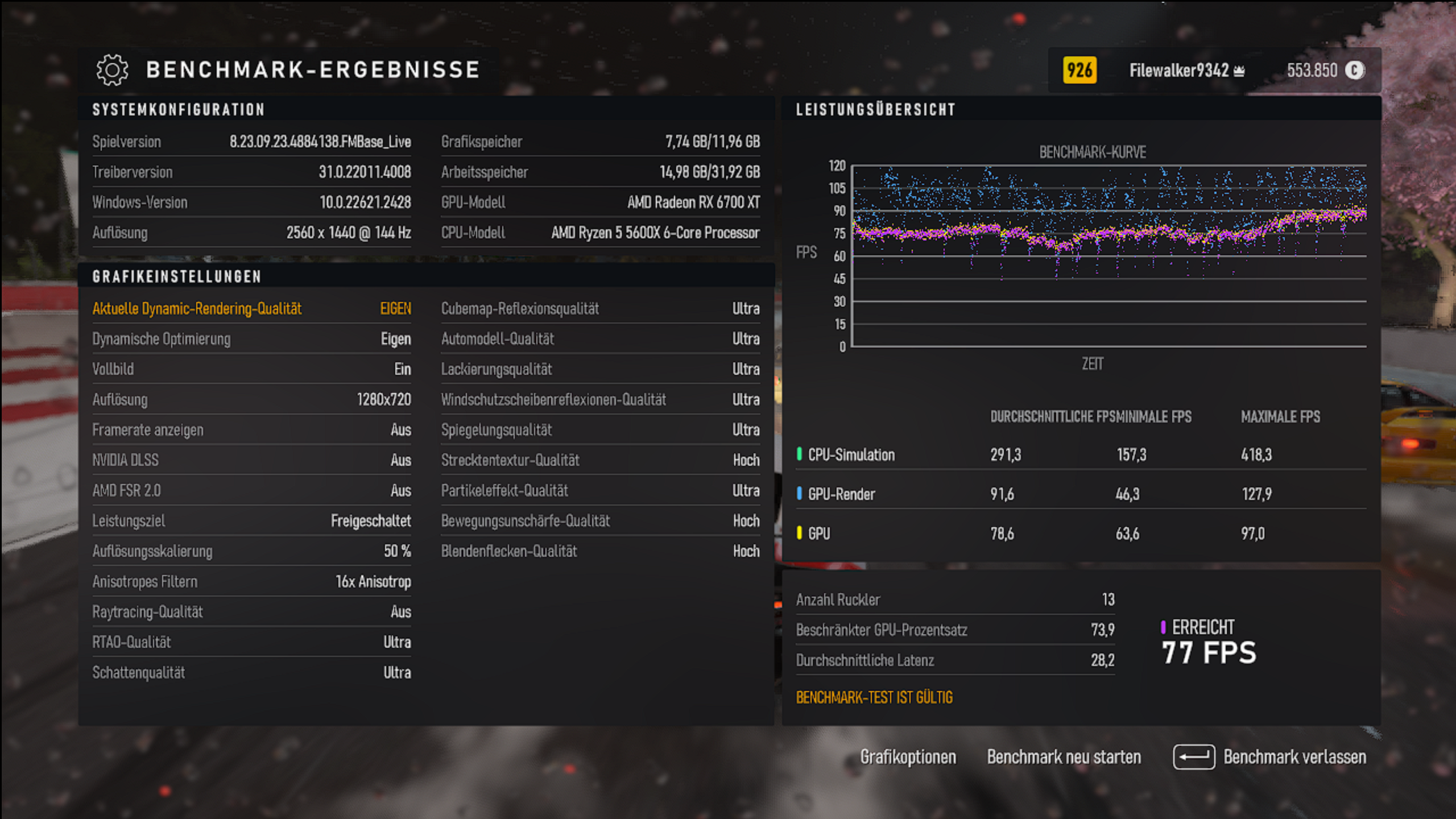 1280x720 mit 50 % Auflösungsskalierung und maximalen Details, RT aus = 77 FPS