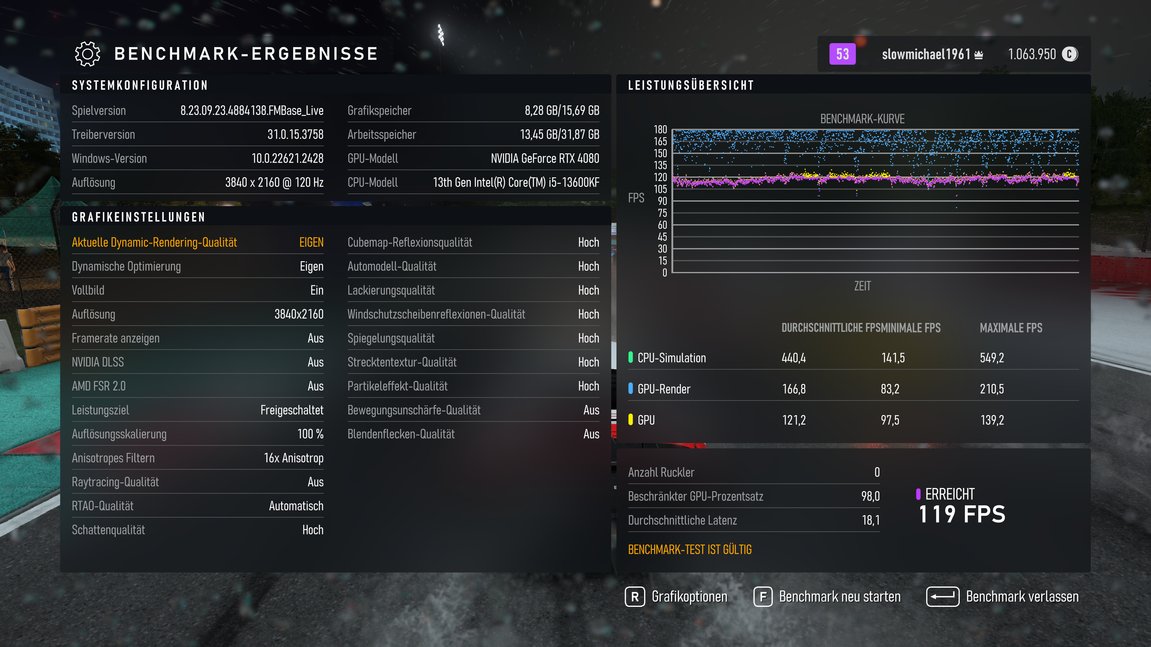 Habe sie in 720p + Auflösungskalierung 50% gemacht, also effektiv in 640x360. Das habe ich gemacht, damit ich auch sicher aus dem GPU-Limit rauskomm.