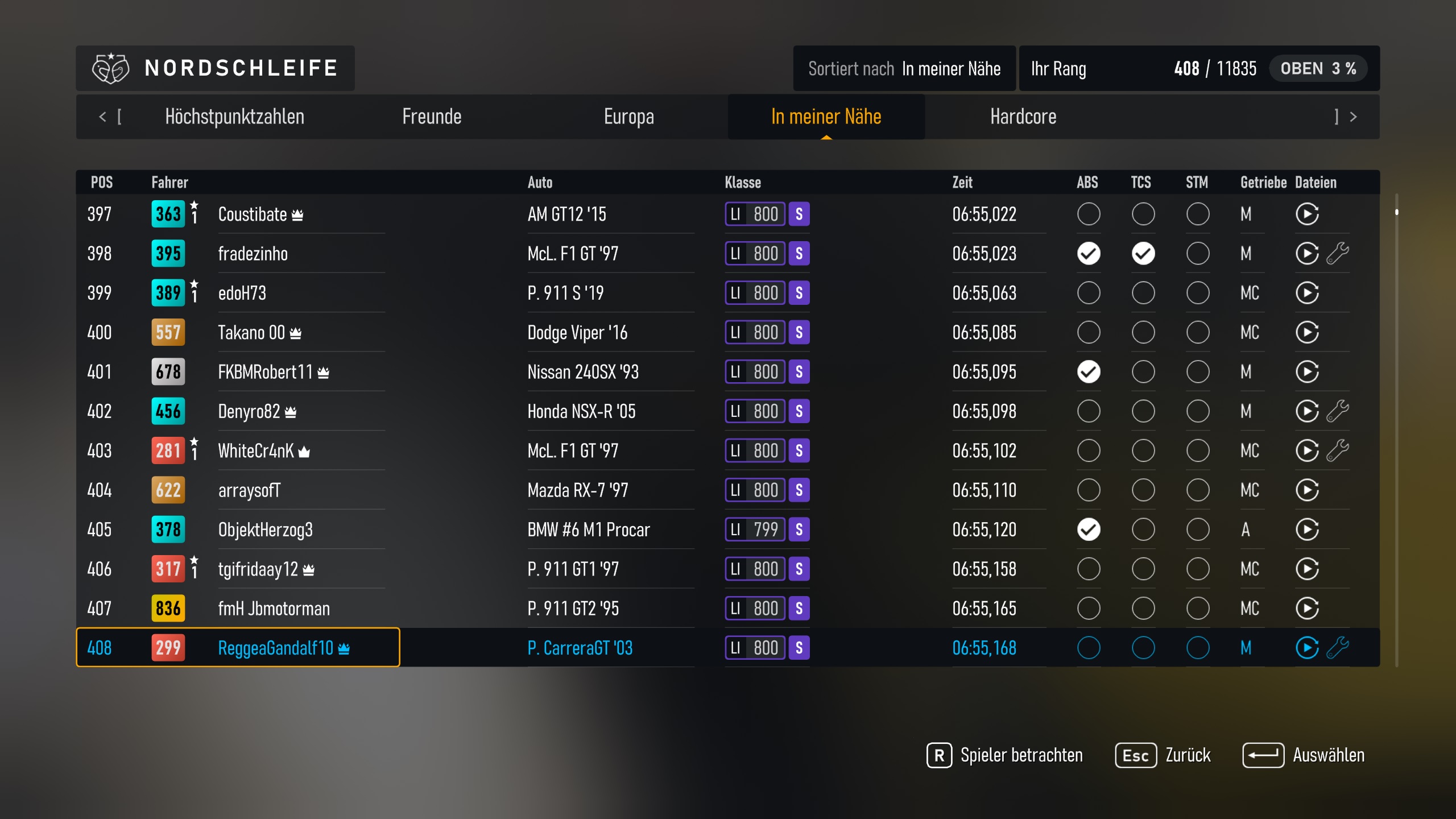 Ich habe es auch mal auf einen Versuch Nordschleife Klasse S ankommen lassen. Den Porsche hatte ich noch aus einem Karriere-Event. Das Tuning, was ich verwendet habe, ist meinem eigenen ziemlich ähnlich.