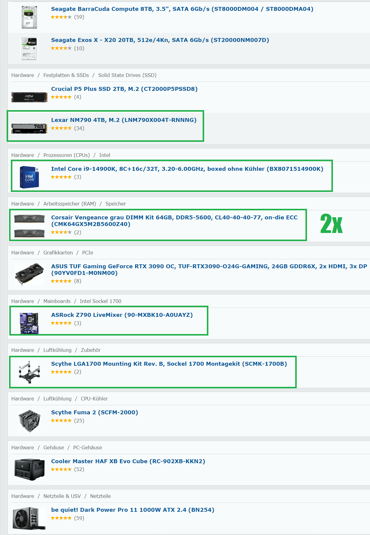- Ich habe hier eine Liste mit den von mir geplanten Teilen. Grün markiert auf der Liste wären die neuen, die bereits bestehenden sind ohne Markierung. Hier als Link zu geizhals ohne Markierung. Ich komme von einem AMD 3900x und 64 GB DDR4 RAM.