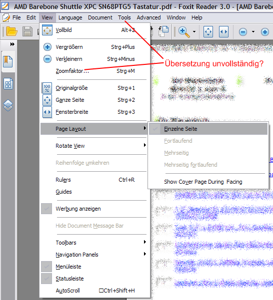 Ich habe mit der Version 3 des Foxit Readers das Problem, dass das Programm nach dem Einspielen der Sprachdatei das Programm nicht vollständig übersetzt wird (-> bitte siehe Bild).
