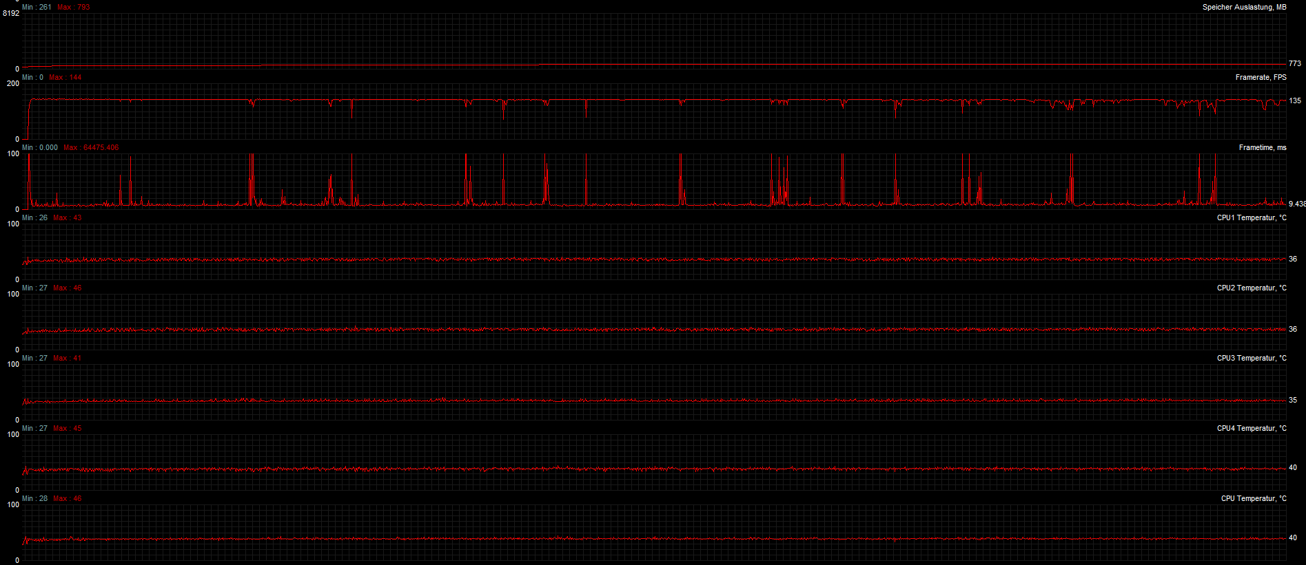 Wichtig :Afterburner konnte die genauen Fps drops von 144 auf 30 Fps irgendwie nicht festhalten ,diese sind in den angefügten Bildern wahrscheinlich die 144 auf 70 Fps drops. Die drops waren ca 1. Sekunde spürbar, genug um auf die nerven zu gehen.