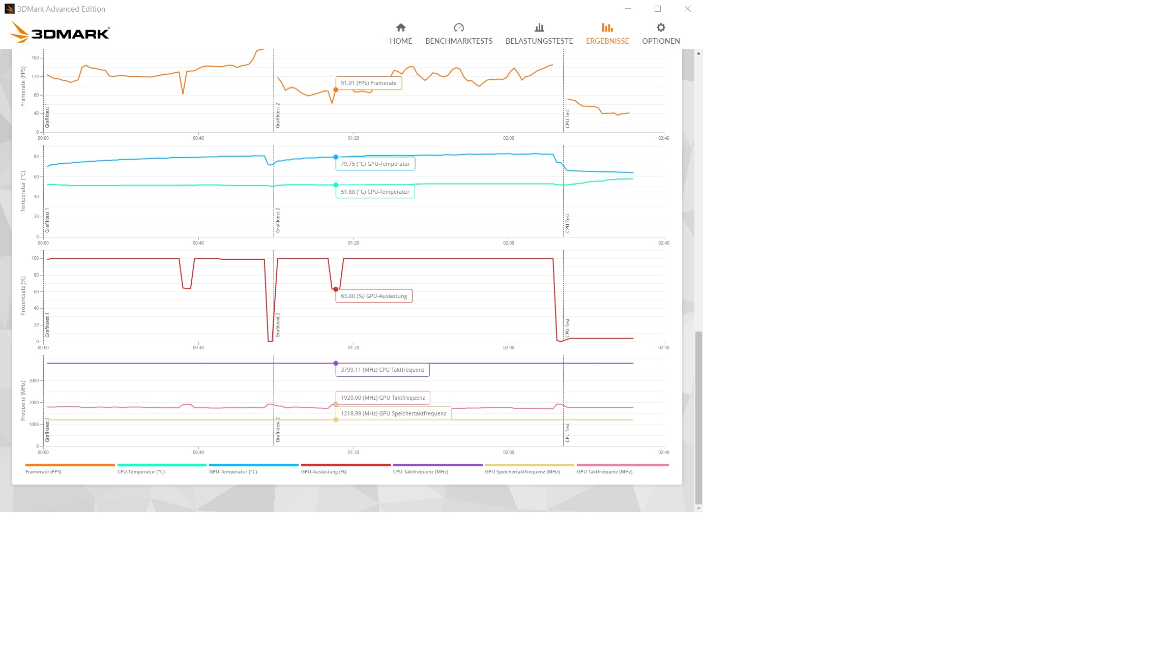 Bild 1+2: Benchmark mit markierten Drops (Temps OK), Hotspot der GPU ist <95°C immer