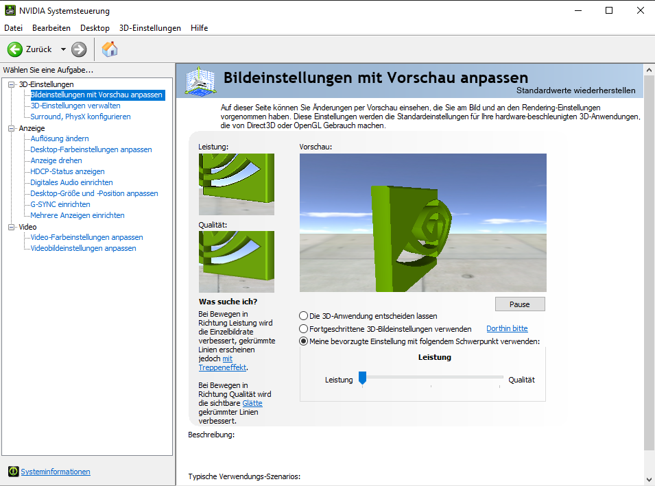 - Nvidia Control Panel 3d-Einstellungen Bildeinstellungen geändert auf Leistung