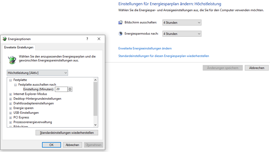 - Energiesparplan auf "Höchstleistung" geändert
