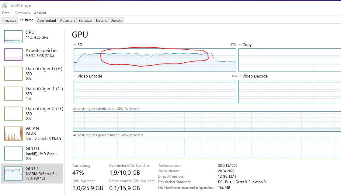 Mach ich. Mir ist gerade im Taskmanager aufgefallen, dass immer wenn ich FPS-Drops habe, der Punkt "3D" ein bisschen fällt. Nur den roten Bereich beachten, am Ende bin ich raus getabt.