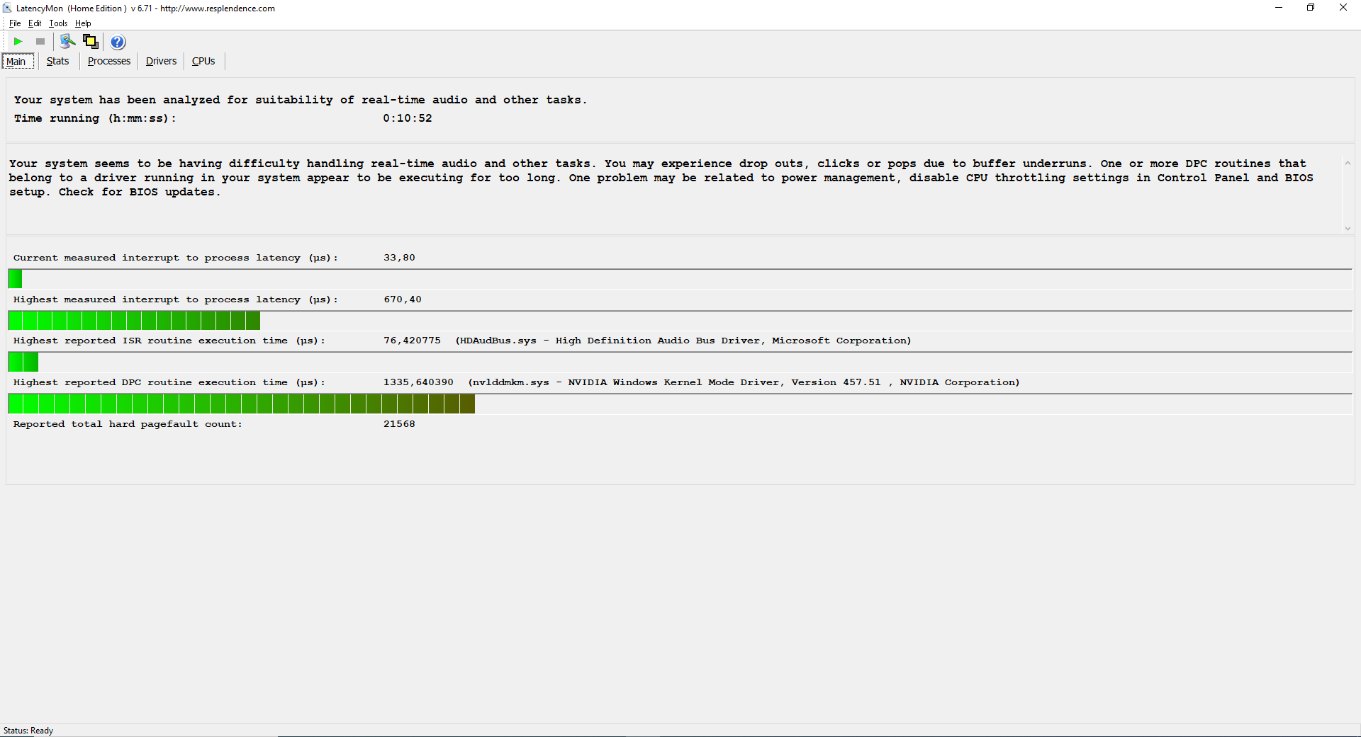 Your system seems to be having difficulty handling real-time audio and other tasks. You may experience drop outs, clicks or pops due to buffer underruns. One or more DPC routines that belong to a driver running in your system appear to be executing for too long. One problem may be related to power management, disable CPU throttling settings in Control Panel and BIOS setup. Check for BIOS updates.