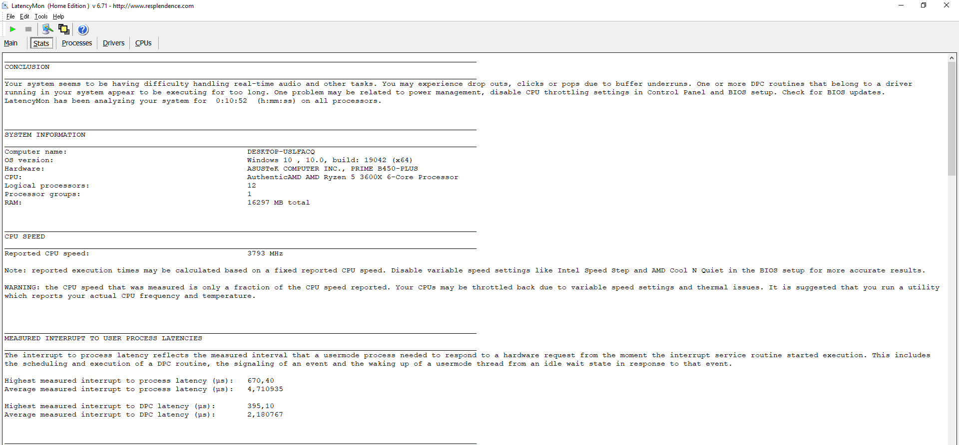 LatencyMon has been analyzing your system for 06:15 (h:mm:ss) on all processors.