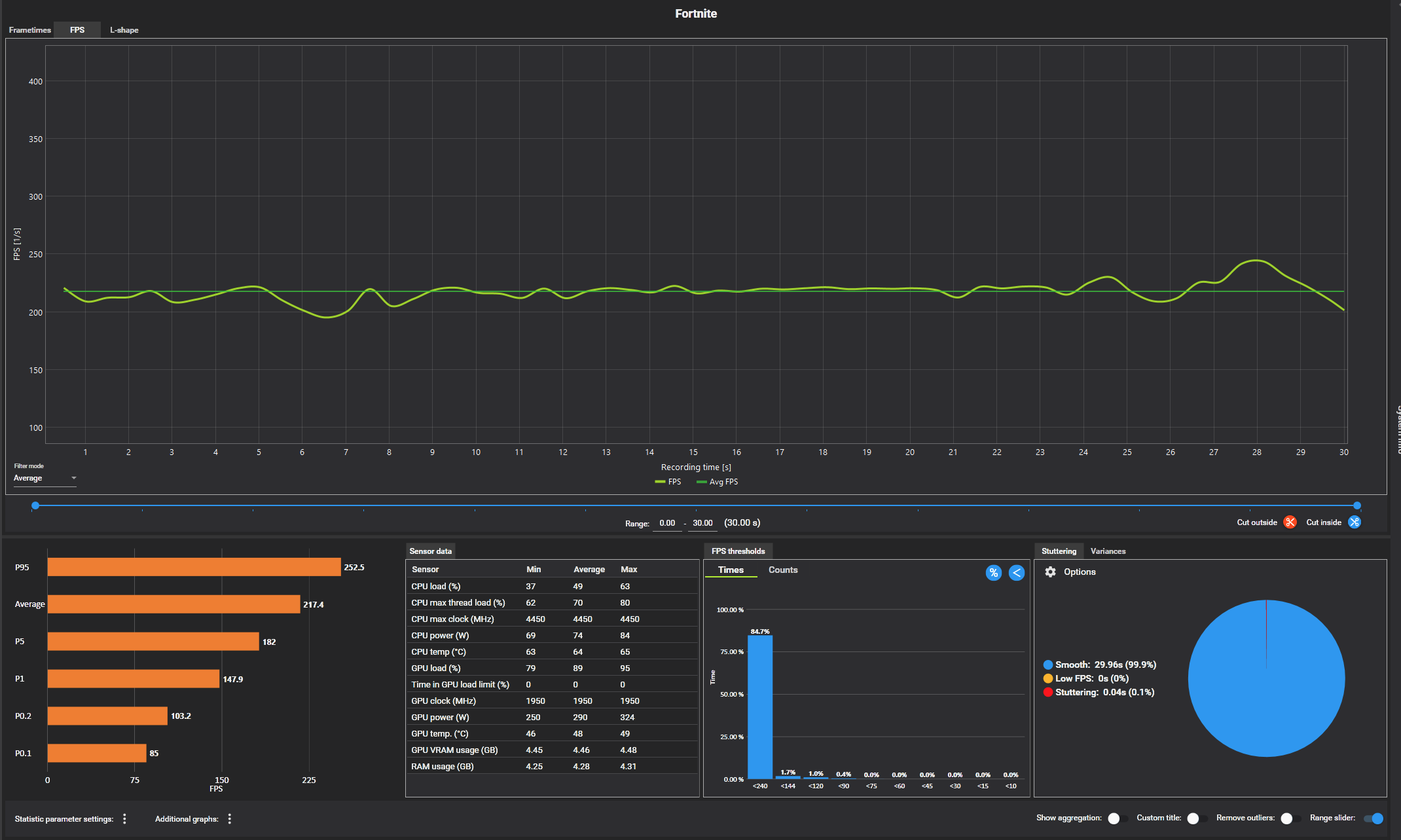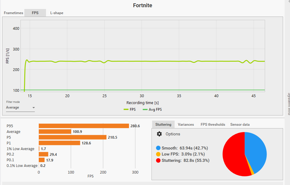 Dein FPS Balken (hellgrün) droppt nicht unter ca. 230 fps und trotzdem nur 100 FPS average und 50% Stuttering...