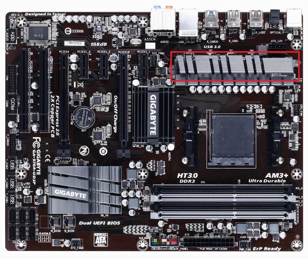 Wenn Du die Wasserkühlung auf dem Gigabyte GA-970A-UD3P weiter verwenden möchtest, befestige mit Kabelbindern einen 60-80mm Lüfter auf dem Kühlkörper von den Spannungswandlern.