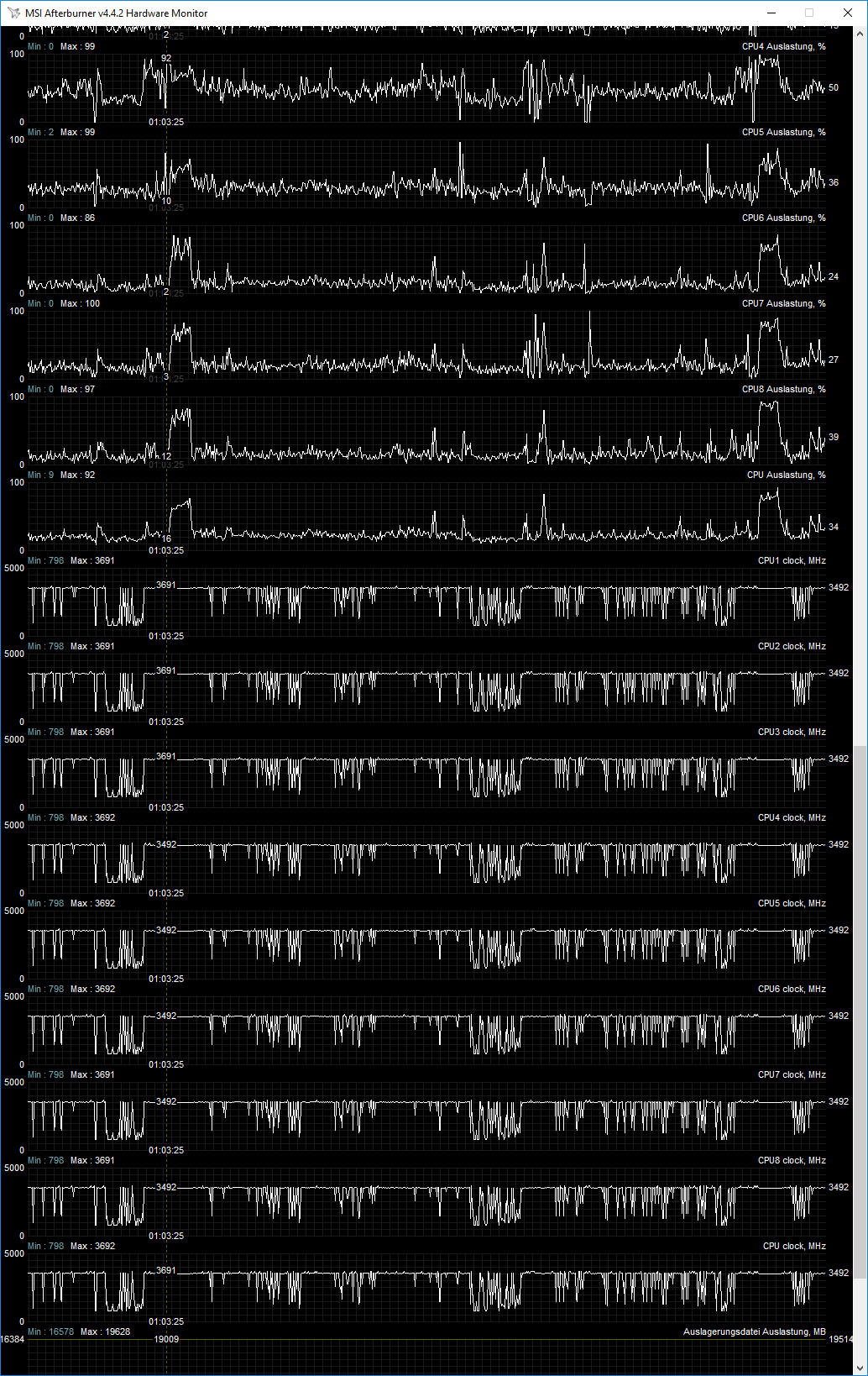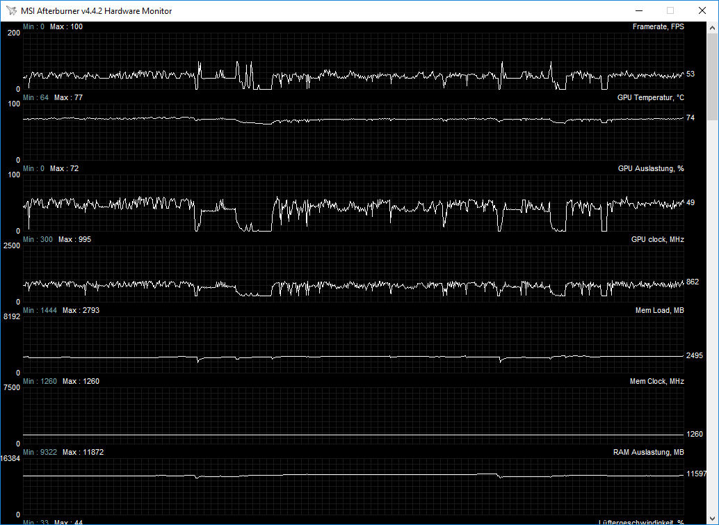 Mit MSI Afterburner/Rivatuner Statistics wollte ich mir dann die GPU Auslastung anschauen, musste aber feststellen dass die Auslastung ständig zwischen einem niedrigen (0/3-5/15-25%) und 100% hin und herspringt.