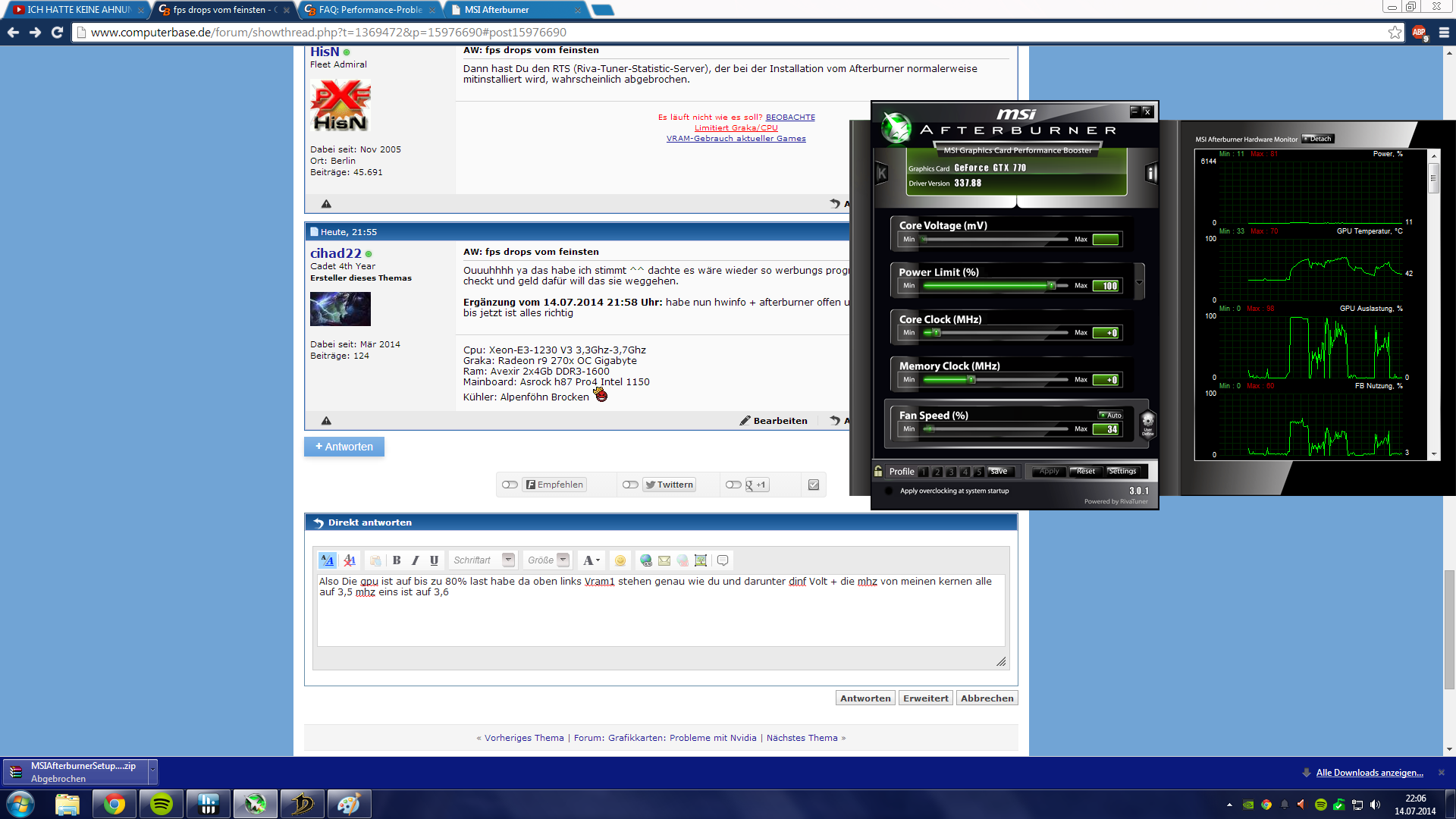 Hallo Leute ich hatte schon mit meiner amd r9 270x fps drops und die karte war etwas defekt also habe ich mir eine neue gekauft da ich dachte es liegt an der r9 nun habe ich eine gtx 770 jetstream oc und habe in manchen spielen fps drops von bis zu 250 fps ich spiele z.b Dragon Nest und jedesmal wenn ich eine Gruppe von Monster kille oder ein skill mache dropt es von 250-300 auf 50-70 + Standbild dann kommt es wieder auf 300-250 woran kann das liegen als ob die graka jetzt alles abchecken muss und erst dann das spiel flüssiger läuft so kommt es mir zumindest vor oder es liegt an einer anderen sache habe V-sync an und aus gemacht bringt nix kann mir da jemand helfen?