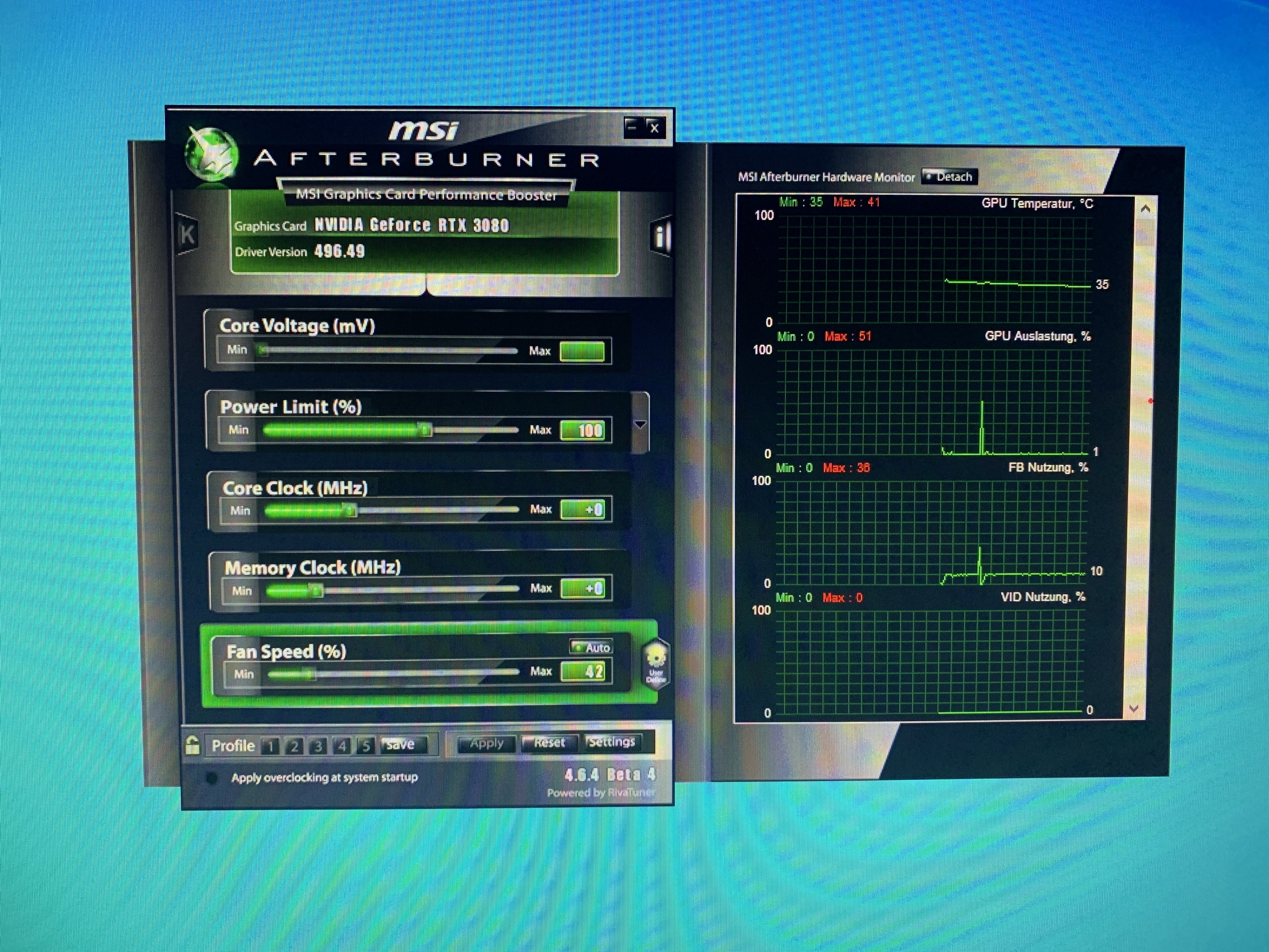 Habe nix eingestellt sieht im afterburner so sis hoffe die Werte sind da okay und da alles richtig so ist. Bin zu dem Zeitpunkt nurse Desktop und habe Taskmanager auf und afterburnerStormfirebird schrieb:Gibt hier einen längern Thread zu den Asus 3080ern.