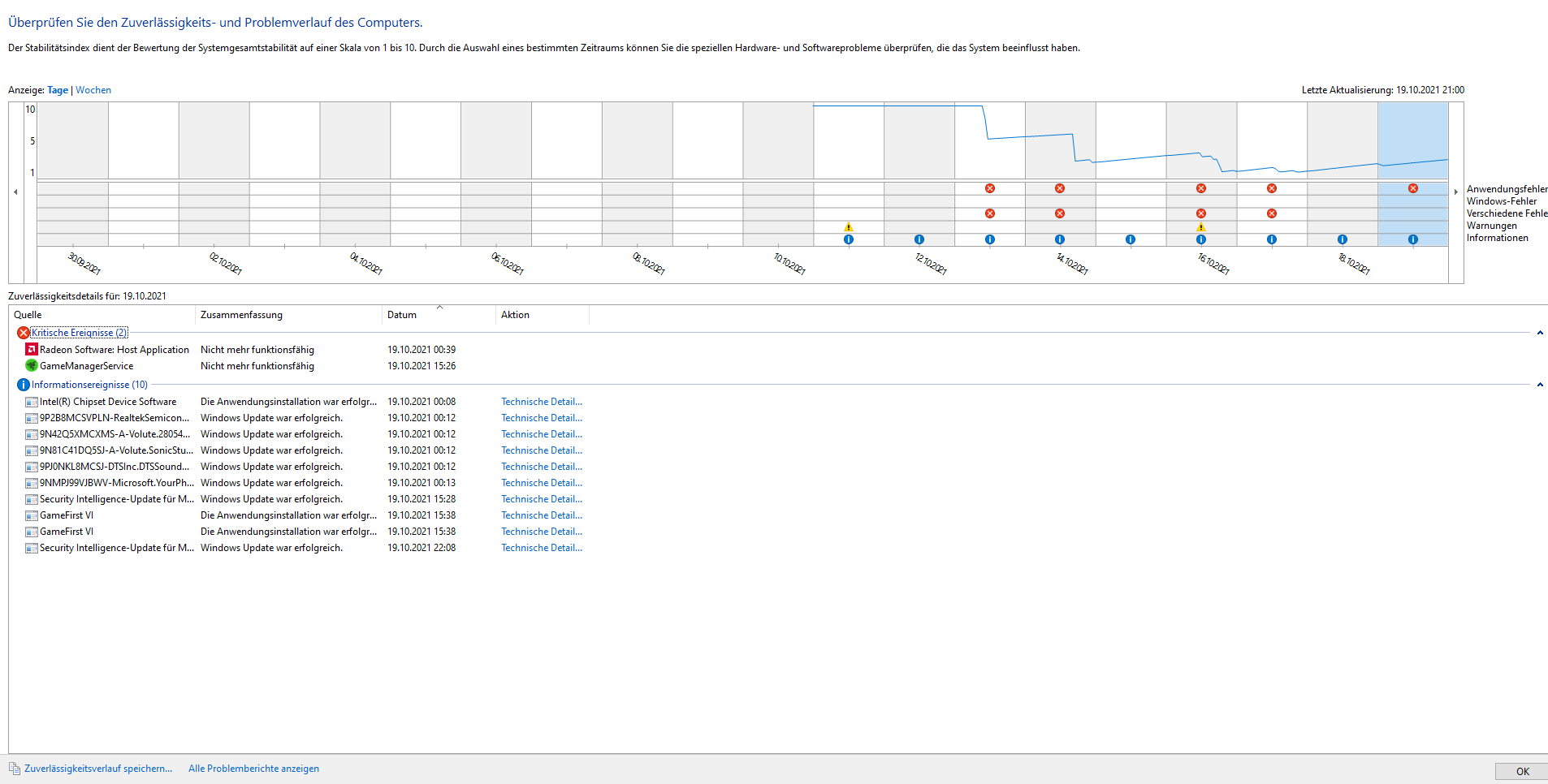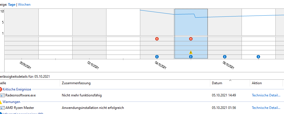 Poste bitte mal einen Screen vom Zuverlässigkeitsverlauf, den Namen einfach in der Windowssuche eingeben.