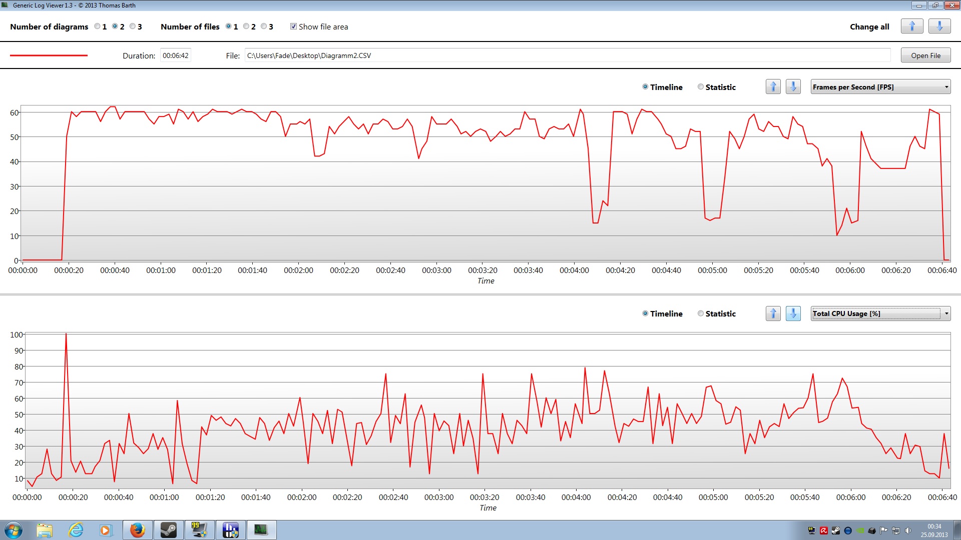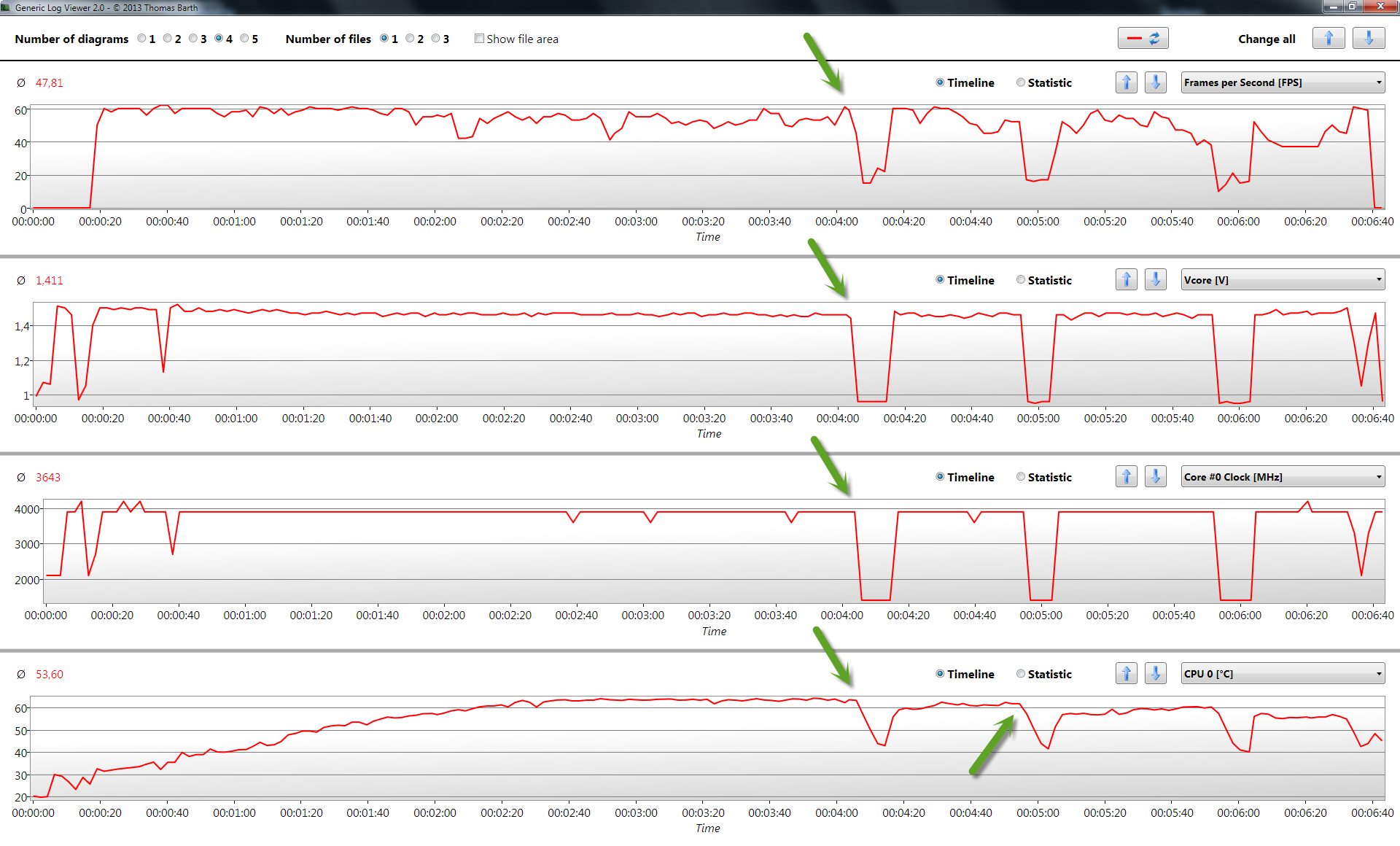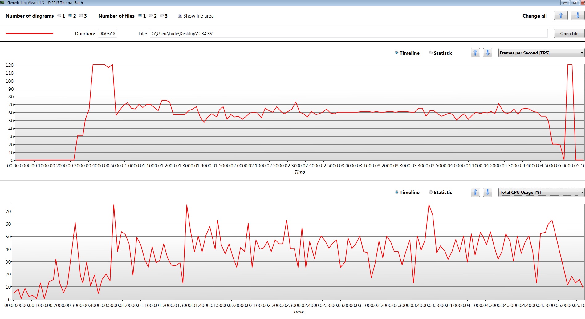 Ich vermute mal "echtes Gamen" war zwischen 1:00 und 4:50, FPS immer 50-70 was ein sehr guter Wert ist! Von daher ist kein Abnormalität zu erkennen, aber vielleicht ist ja auch meine Annahme falsch ...